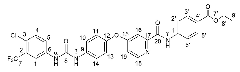 Ethyl 4-(4-(4-(3-(4-chloro-3-(trifluoromethyl)phenyl)ureido)phenoxy)picolinamide)benzoate (SRF-BEE). A suspension of 452 mg (1 mmol) of SRF-A in 10 mL of a 1 : 1 pyridine–THF mixture was combined with 300 mg (1.18 mmol) of BOP-Cl, stirred for 10 min, and then combined with 230 mg (1.39 mmol) of a p-aminobenzoic acid ethyl ester (ABEE). The reaction mixture was stirred at room temperature for 1.5 h, before another 300 mg (1.18 mmol) of BOP-Cl was added. After 10 min, 230 mg (1.39 mmol) of ABEE was added and stirring was continued at room temperature for 1.5 h. Water (30 ml) was added and stirred for 1–1.5 h to form a homogeneous precipitate. The precipitate was filtered and washed with water (thrice, 20 mL each). After air drying, the precipitate was suspended in 10 mL of methanol, filtered, washed with 5 mL of methanol, filtered, and air-dried to yield 442 mg (74%) of SRF-BEE. 1H NMR (DMSO-d6): δ 10.93 (1H, s, NHγ), δ 9.22 (1H, s, NHα), 9.01 (1H, s, NHb), 8.64 (1H, d, J 5.6, H18), 8.13 (1H, d, J 1.9, H16), 8.05 (2H, d, J 8.8, H3′ and H5′), 7.95 (2H, d, J 8.7, H2′ and H6′), 7.71–7.59 (4H, m, H4, H10 and H14, H19), 7.54 (1H, d, J 2.5 H1), 7.29–7.16 (3H, m, H5, H11 and H13), 4.30 (2H, q, J 7.1, H8′), 1.32 (3H, t, J 7.1, H9′). 13C NMR (DMSO-d6): δ 166.70 (C7′), 165.75 (C15), 162.86 (C20), 152.94 (C8), 152.29 (C17), 150.94 (C18), 148.25 (C12), 142.97 (C1´), 139.78 (C9), 137.62 (C6), 132.43 (C4 or C5), 130.46 (C3′ and C5′), 127.20 (q, J 30.5, C2), 125.48 (C4′), 123.57 (C4 or C5), 123.28 (q, J 273, C7), 122.85 (C3), 121.88 (C10 and C14), 121.02 (C11 and C13), 120.20 (C2′ and C6′), 117.31 (q, J 5.4, C1), 115.19 (C19), 110.02 (C16), 60.93 (C8′), 14.63 (C9′). 19F NMR (DMSO-d6): δ ‒61.44 (CF3).