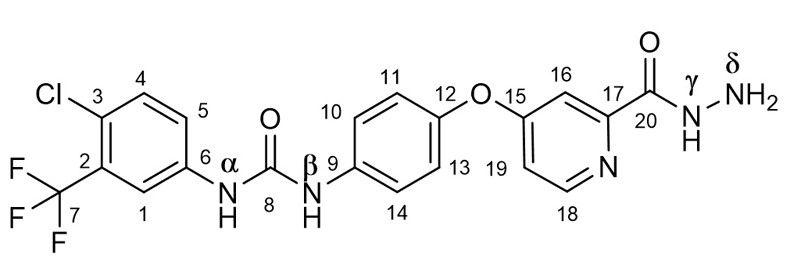 1-(4-chloro-3-(trifluoromethyl)phenyl)-3-(4-((2-(hydrazinecarbonyl)pyridin-4-yl)oxy)phenyl)urea (SRF-H). A suspension of 466 mg (1 mmol) of SRF-ME in 3 mL of a 2 : 1 MeOH–CH2Cl2 mixture was combined with 250 mg (5 mmol) of hydrazine hydrate and stirred for 10 min until the dissolution of the starting compound. After 2 h, 2 mL of MeOH was added and the mixture was evaporated to a thick syrup. After addition of 10 mL of H2O, the mixture was triturated until a homogeneous precipitate formed, cooled at 0°C for 1.5 h, filtered, washed with water (twice, 3 mL each), and air-dried to yield 404 mg (87%) of SRF-H. 1H-NMR (DMSO-d6): δ 9.86 (1H, s, NHγ), 9.19 (1H, s, NHα), 8.97 (1H, s, NHb), 8.48 (1H, d, J 5.6, H18), 8.12 (1H, d, J 2.3, H16), 7.72–7.55 (4H, m, H4, H10 and H14, H19), 7.38 (1H, d, J 2.5 H1), 7.17 (2H, d, J 8.9, H11 and H13), 7.12 (1H, dd, J 5.6 and 2.6, H5), 4.56 (2H, s, NHd). 13C NMR (DMSO-d6): δ 166.31 (C15), 162.45 (C20), 152.94 (C8), 152.60 (C17), 150.96 (C18), 148.36 (C12), 139.79 (C9), 137.51 (C6), 132.43 (C4 or C5), 127.22 (q, J 30.8, C2), 123.58 (C4 or C5), 123.29 (q, J 273, C7), 122.86 (d, J 1.7, C3), 121.86 (C10 and C14), 121.01 (C11 and C13), 117.34 (q, J 5.7, C1), 114.33 (C19), 109.25 (C16). 19F NMR (DMSO-d6): δ ‒61.45 (CF3).