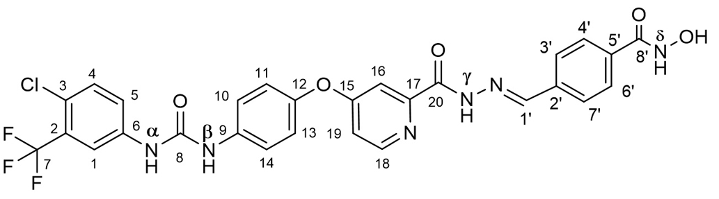 (E)-4-((2-(4-(4-(3-(4-chloro-3-(trifluoromethyl)phenyl)ureido)phenoxy)picolinoyl)hydrazinoylidene)methyl)-N-hydroxybenzamide (SRF-H-BHA). A solution of 85 mg (0.515 mmol) of 4-formyl-N-hydroxybenzamide [9] in 3.5 mL of MeOH–CH2Cl2, 5 : 2, and 30 μL of AcOHcat was added to a suspension of 233 mg (0.50 mmol) of SRF-H in 3 mL of a 2 : 1 MeOH–CH2Cl2 mixture, and the mixture was stirred for 5 min until the starting compound had dissolved. After 4 h, the resulting precipitate was filtered, washed successively on a filter with 10 mL of EtOH and 5 mL MeOH, and air-dried to yield 258 mg (84%) of SRF-H-BHA. 1H NMR (DMSO-d6): δ 12.23 (1H, s, NHγ), 11.27 (1H, s, NHd), 9.25 (1H, s, NHα), 9.08 (1H, s, OH), 9.04 (1H, s, NHb), 8.69 (1H, s, H1′), 8.60 (1H, d, J 5.6, H18), 8.13 (1H, d, J 2.2, H16), 7.84 (2H, d, J 8.4, H3′ and H7′), 7.71 (2H, d, J 8.4, H4′ and H6′), 7.71–7.59 (4H, m, H4, H10 and H14, H19), 7.50 (1H, d, J 2.5, H1), 7.25–7.18 (3H, m, H5, H11 and H13). 13C NMR (DMSO-d6): δ 166.56 (C15), 164.14 (C8′), 160.49 (C20), 152.96 (C8), 152.23 (C17), 151.04 (C18), 148.98 (C1′), 148.27 (C12), 139.80 (C9), 137.62 (C6), 137.23 (C2′), 134.46 (C5′), 132.48 (C4 or C5), 127.93 (C3′ and C7′), 127.47 (C4′ and C6′), 127.21 (q, J 30.7, C2), 123.63 (C4 or C5), 123.30 (q, J 273, C7), 122.86 (d, J 1.3, C3), 121.94 (C10 and C14), 121.05 (C11 and C13), 117.35 (q, J 5.7, C1), 115.16 (C19), 110.14 (C16). 19F NMR (DMSO-d6): δ ‒61.43 (CF3).