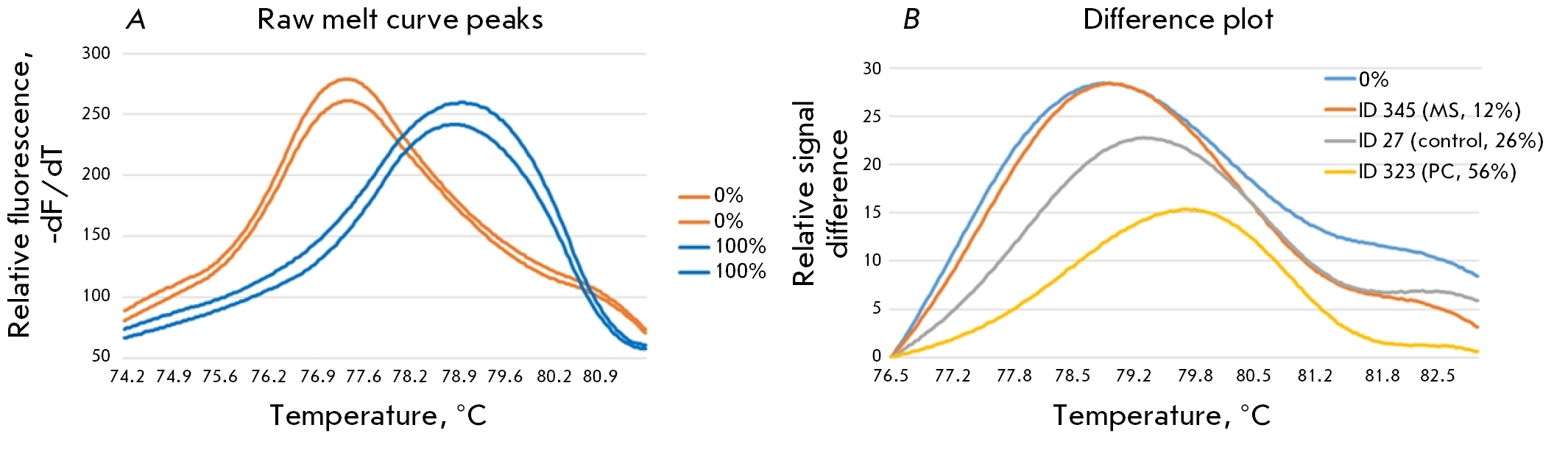 Fig. 1. Assessment of LINE-1 methylation levels via methyl-sensitive high-resolution melting curve analysis (MS-HRM). (A) – raw melting curves and melting peaks of fully methylated (100%) and fully unmethylated (0%) standard samples; (B) – melting curves for the standard sample (0%) and the three tested samples with high (56%), low (12%), and medium (26%) methylation levels, converted to difference plots