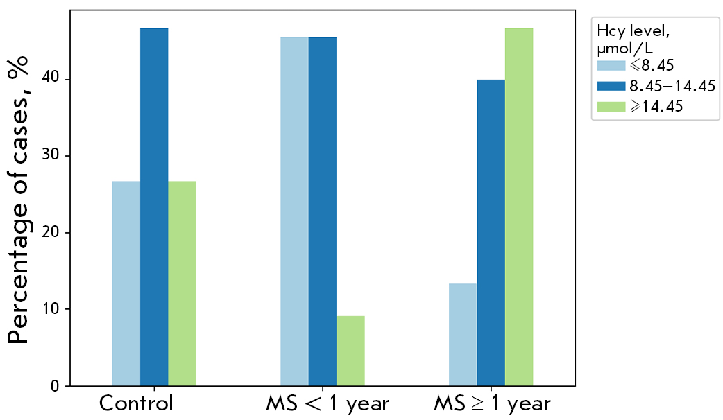 Our earlier work identified the changes in folate metabolism parameters specific to the initial stage of MS (notably, decreased homocysteine levels at adult MS onset) [21]. Hence, in this work, we evaluated folate metabolism parameters across all MS patients, with a separate analysis for those with disease durations of less than and greater than a year. Using this approach, we found that in the group of patients with MS, those with a duration of less than 1 year had predominantly low and medium values of homocysteine levels. In contrast, high and medium values were predominant in the prolonged course (Fig. 4). Homocysteine levels relative to the lower quartile (≤ 8.45 μmol/L) and upper quartile (≥ 14.45 μmol/L) in the control group were taken as low and high levels.