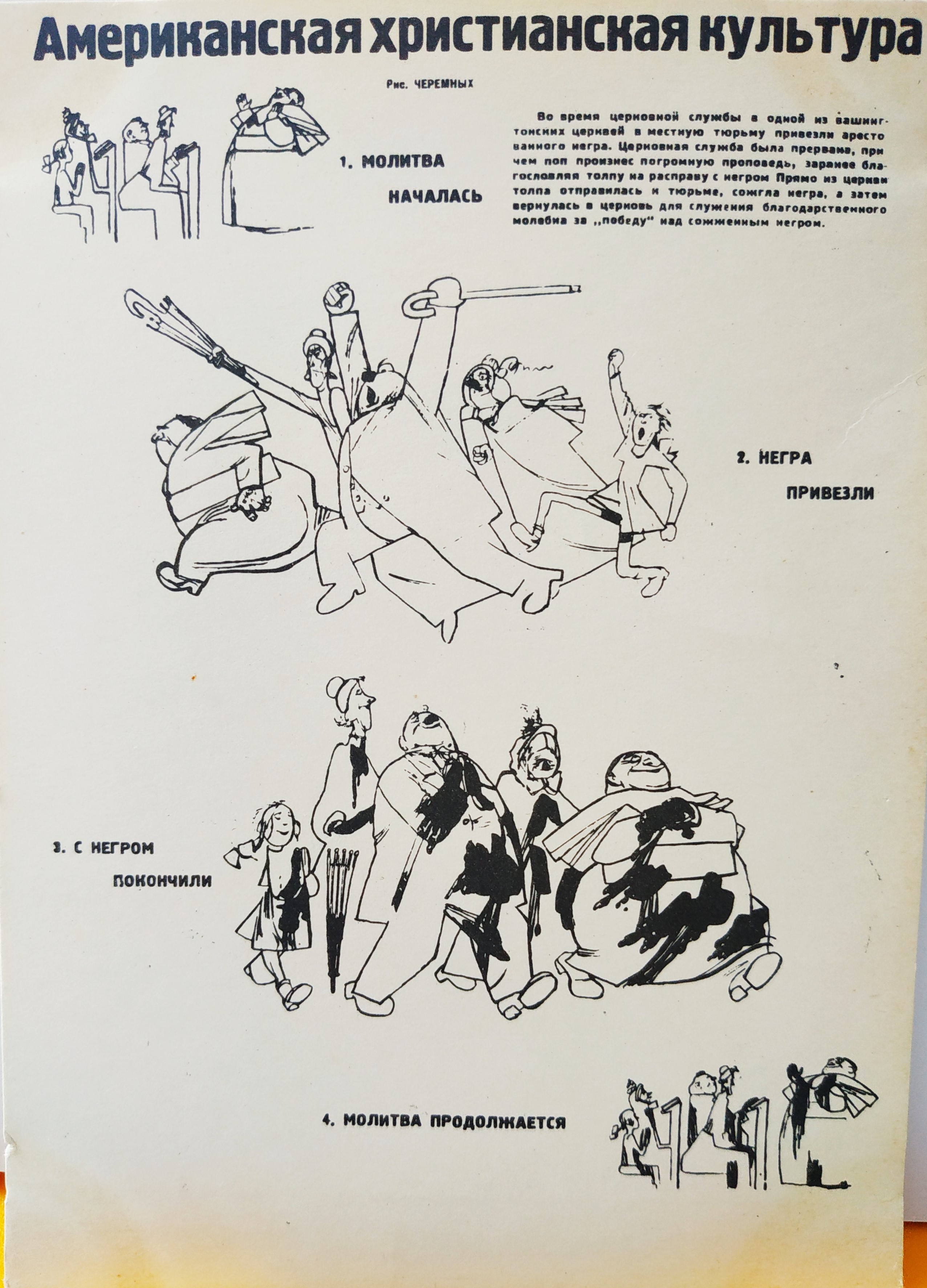 Внимание уделено и внешнеполитическому аспекту, представленному через образ американских верующих, не пренебрегающих убийством представителя другой расы. Примеры плакатов, изданных в 1963 г., представляют верующих в числе врагов советской власти и ставят их в один ряд с внешнеполитическими противниками холодной войны, подвергая сомнению истинность их устремлений.