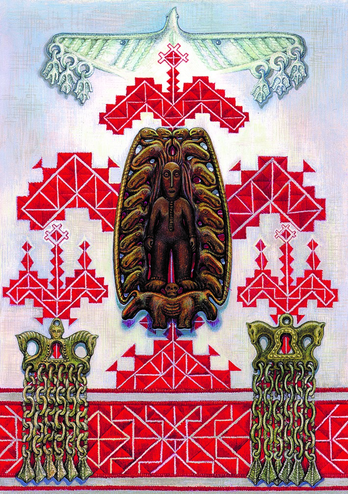 На удмуртском обрядовом поясе «зар» изображена та же композиция, только состоит она из трех древовидных фигур, причем на многих образцах центральное дерево напоминает очертаниями женскую фигуру с поднятыми к небу руками-крыльями. Возникают вопросы: что могло послужить основанием для представления о неразрывной связи Богини-матери и мирового дерева и даже об их взаимозаменяемости в декоративном искусстве; как формировался образ богини и почему она часто и сама изображалась птицей или звероподобной; почему этот сюжет, перешедший с металлических украшений в вышивку, так устойчив во времени и популярен у разных народов? Безусловно, он связан с глубинными пластами мифологии, с определенным основополагающим комплексом древнейших религиозных верований.