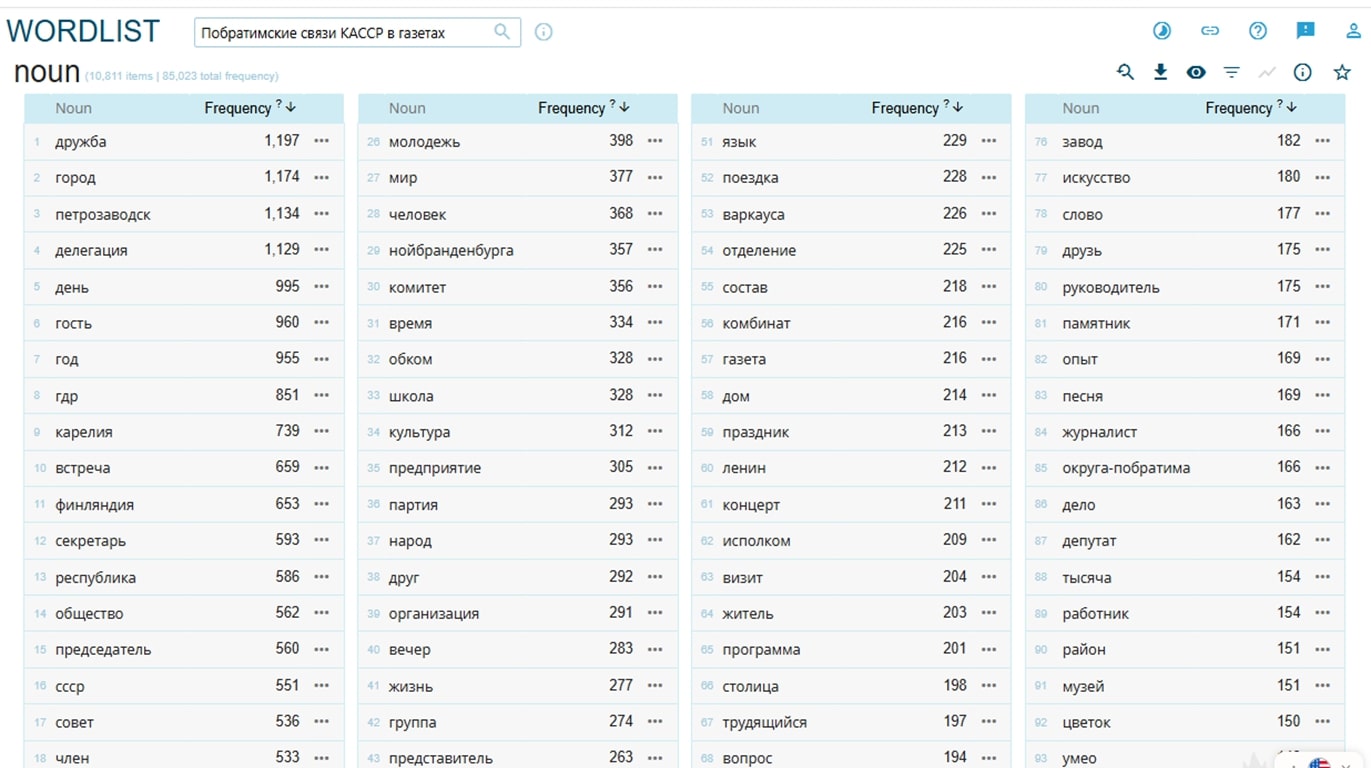 Materials and Methods. This study examines the vocabulary of town-twinning ties in the press of Soviet Karelia, drawing on corpora of articles from the newspapers Leninskaya Pravda and Komsomolets (1960–1980). The methodology is based on an integration of corpus technologies (using the Sketch Engine manager) and traditional discourse analysis. The text corpus was processed using the following tools: Word List (for frequency analysis), N-grams (to identify formulaic phrases), and Word Sketch Differences (to analyse contrasts in collocations). This integrated approach enabled the translation of qualitative observations into quantitatively verifiable data.