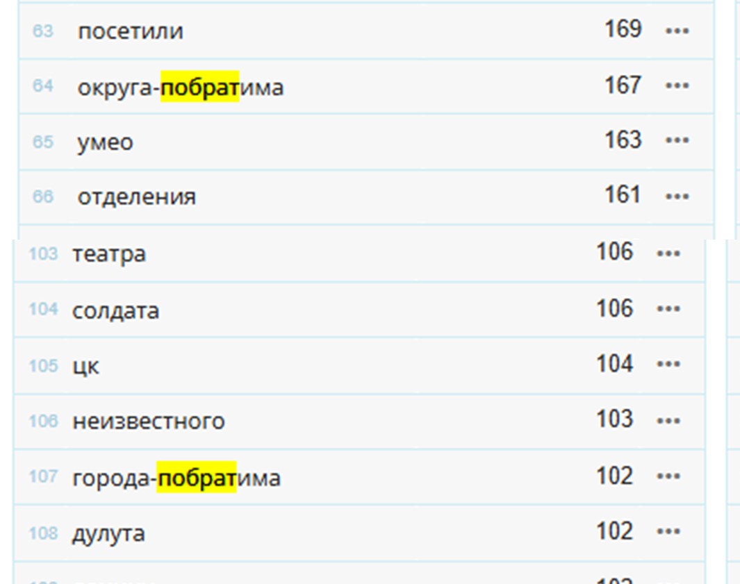Р и с. 1. Частотный список, составленный на основе корпуса текстов «Ленинской правды» и «Комсомольца» по побратимской тематике