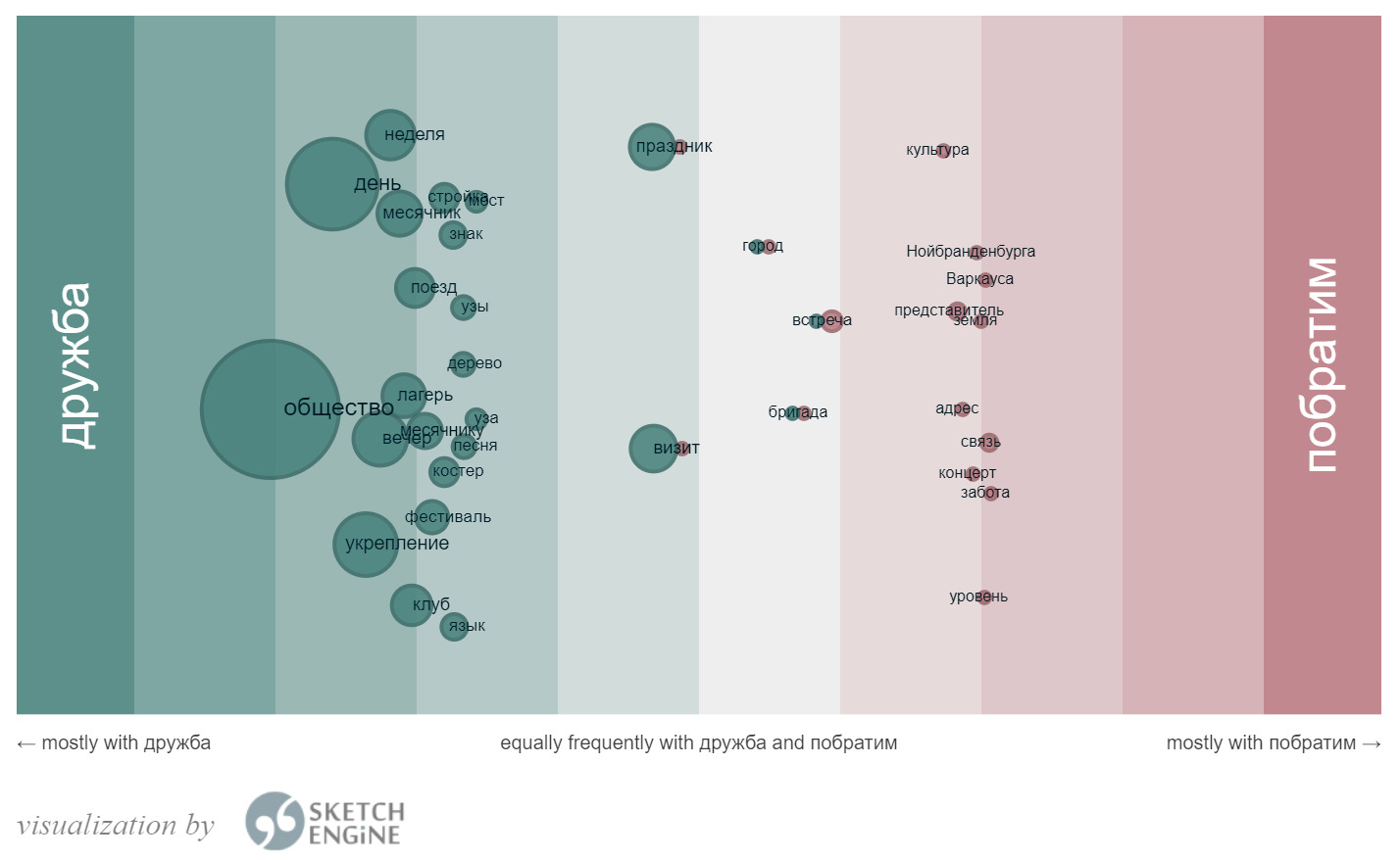 F i g. 3. Visualization of the results of the “Word Sketch Difference” tool for the lexemes “friendship” and “twin-city” (gen_modifies)