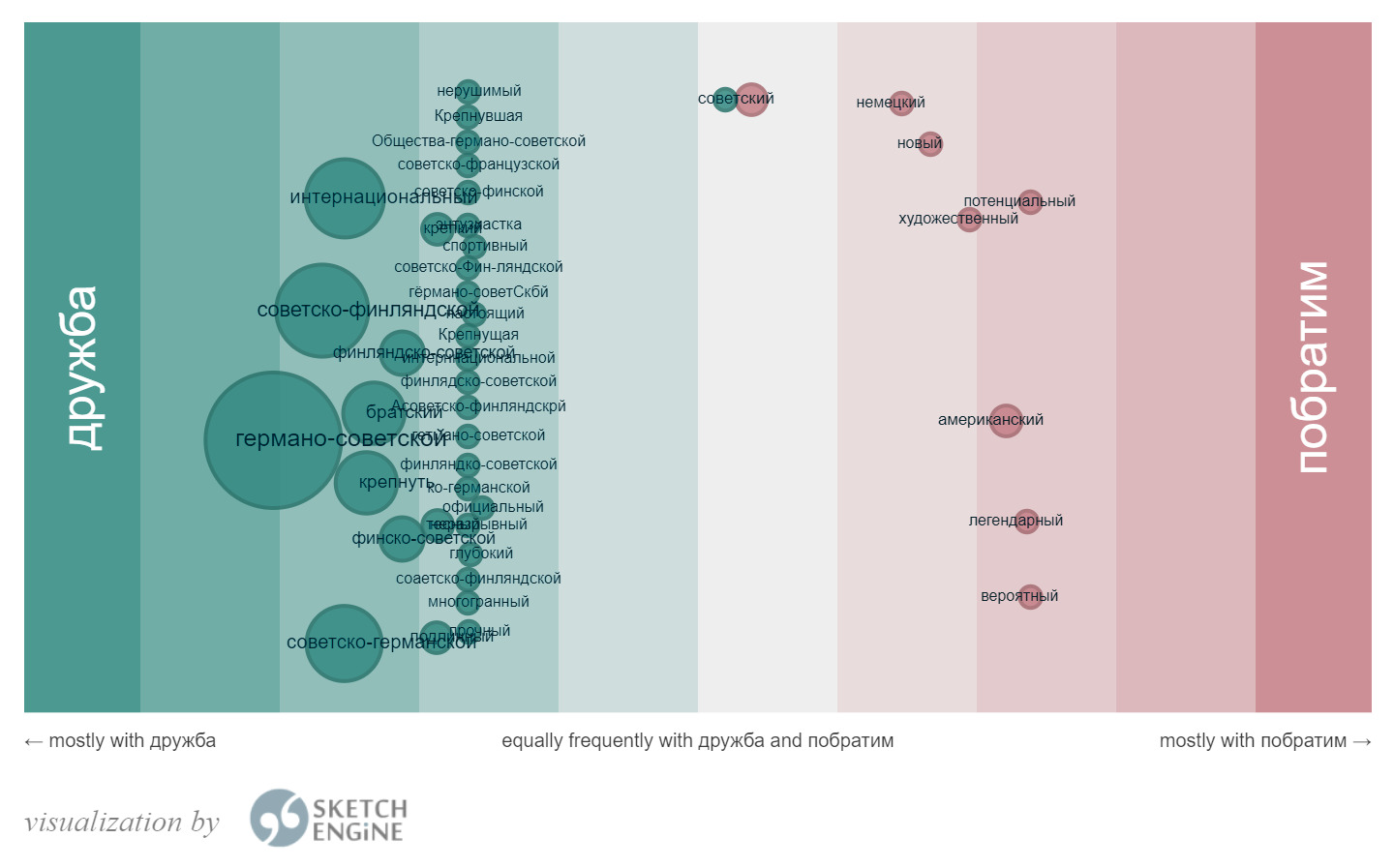Р и с. 3. Визуализация результатов работы инструмента Word Sketch Difference для лексем «дружба» и «побратим» (gen_modifies)