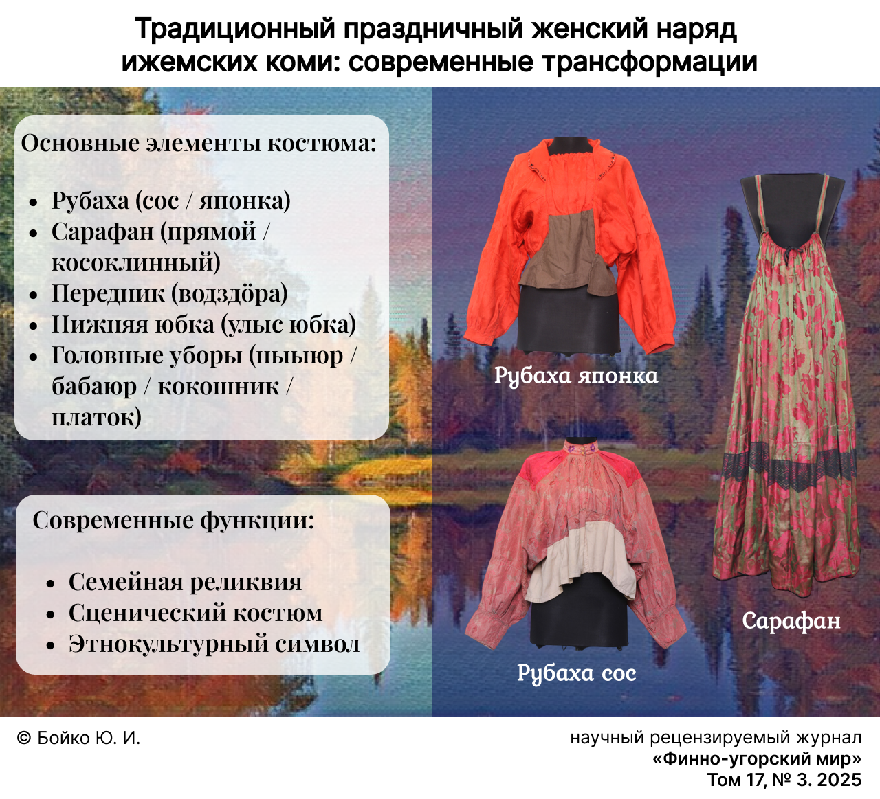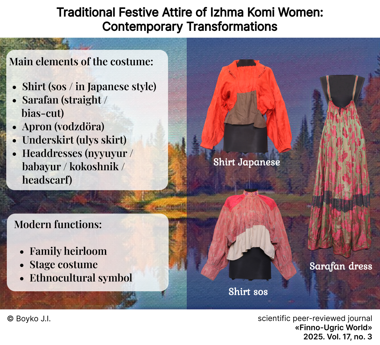 Introduction. The traditional costume complex, which occupies a distinctive place in the cultural heritage of any people, has long attracted the attention of researchers across a broad range of humanities. The folk festive women’s clothing of the Izhma Komi, a local variant whose specific characteristics remain insufficiently studied to this day, ranks among the most vivid and sought-after elements of their ethnic culture. The aim of this study is to examine the current state of the traditional festive attire of Izhma Komi women residing in the Izhma District of the Komi Republic.
