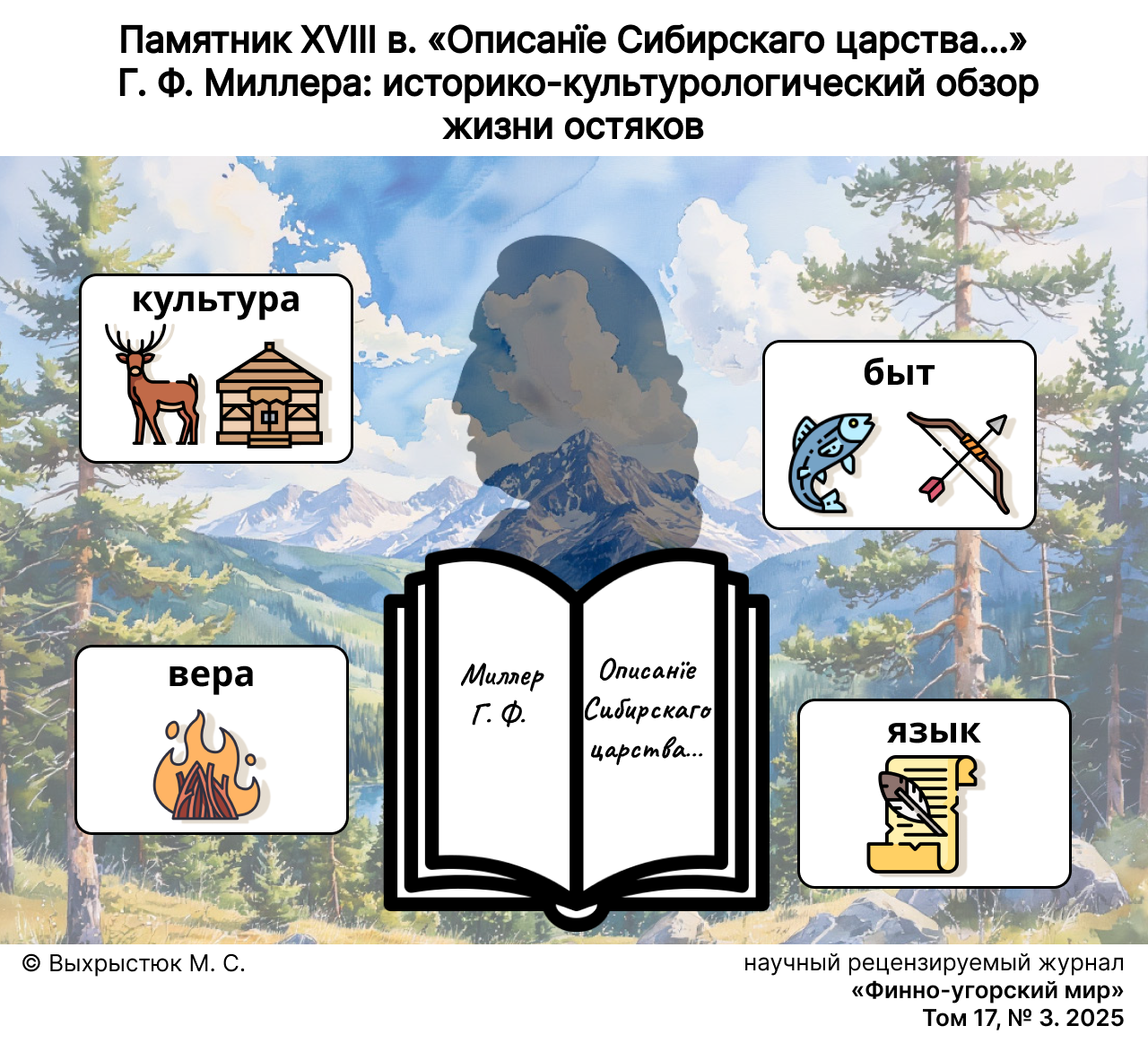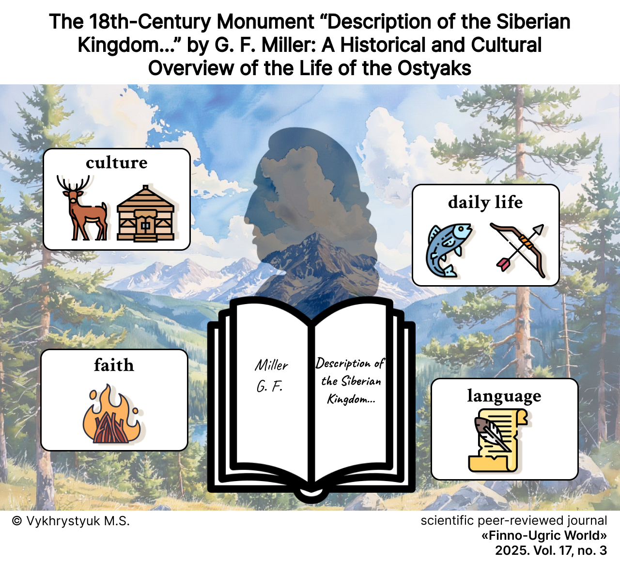 Introduction. In recent decades, researchers have been actively studying written sources of the past stored in central and regional archives across the country. G. F. Miller’s work “Description of the Siberian Kingdom...” presents a portrayal of the life of the indigenous peoples of Siberia, based on the author’s personal observations. Particular attention in the source is given to information about the Ostyaks – descriptions of their culture, daily life, religion, and interactions with other peoples inhabiting Siberia. The analysis of the scholar’s work is of great importance in the context of preserving the country’s cultural heritage, which underscores the relevance of this study. The aim of the research is to conduct a historical and cultural overview of the life of the Ostyaks in Siberia based on the chronicle source.