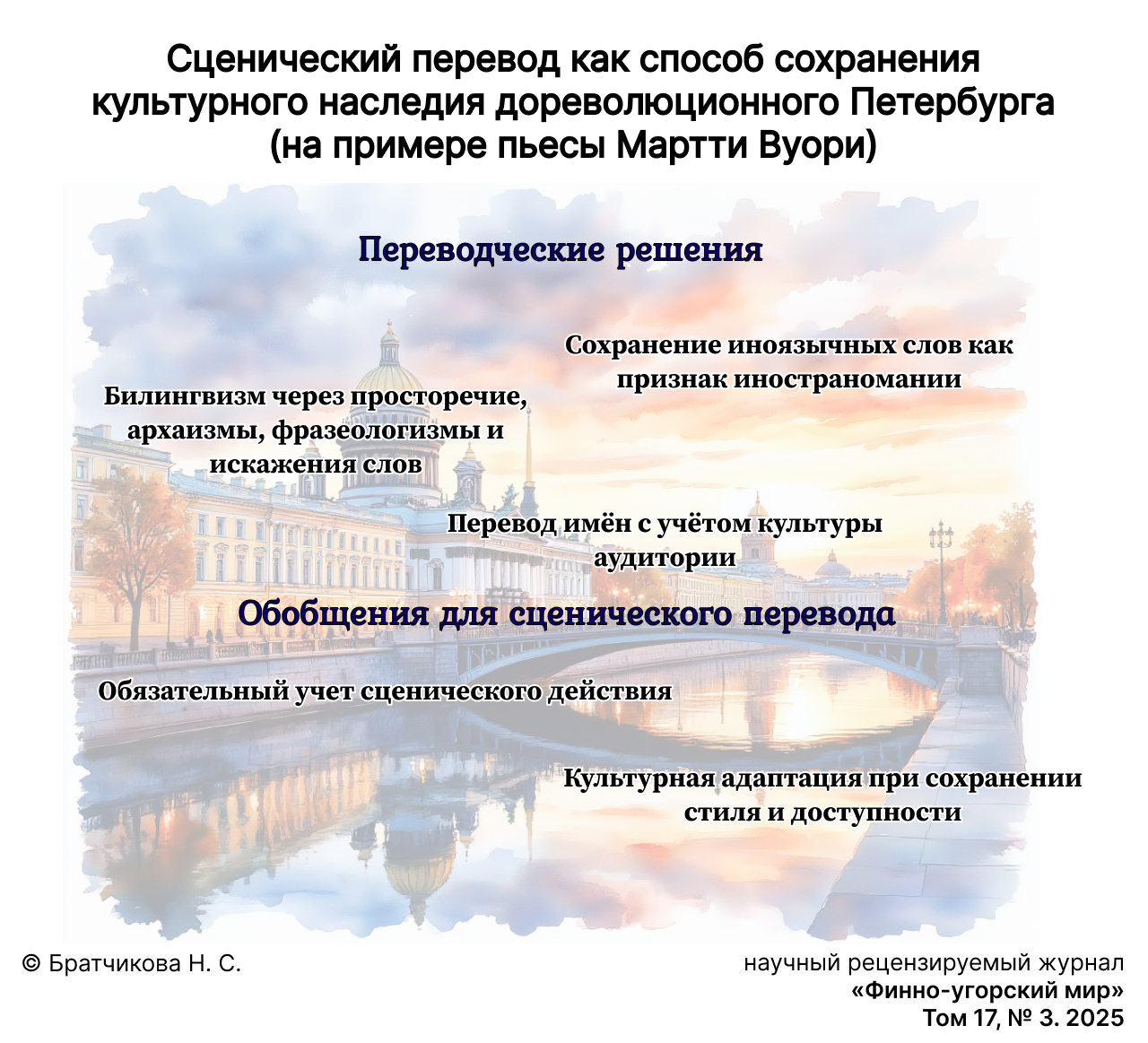 Conclusion. The conclusions drawn by the author, namely the identified obligatory subordination of the linguistic system to the non-linguistic system within the framework of their joint functioning, the consideration of the audience’s experience alongside the national experience embodied in the original text, contribute to the development of the theory of theatrical translation. A promising direction is the study of artistic and expressive means for conveying the everyday life and morals of the socio-cultural environment of St. Petersburg at the turn of the 19th and 20th centuries.