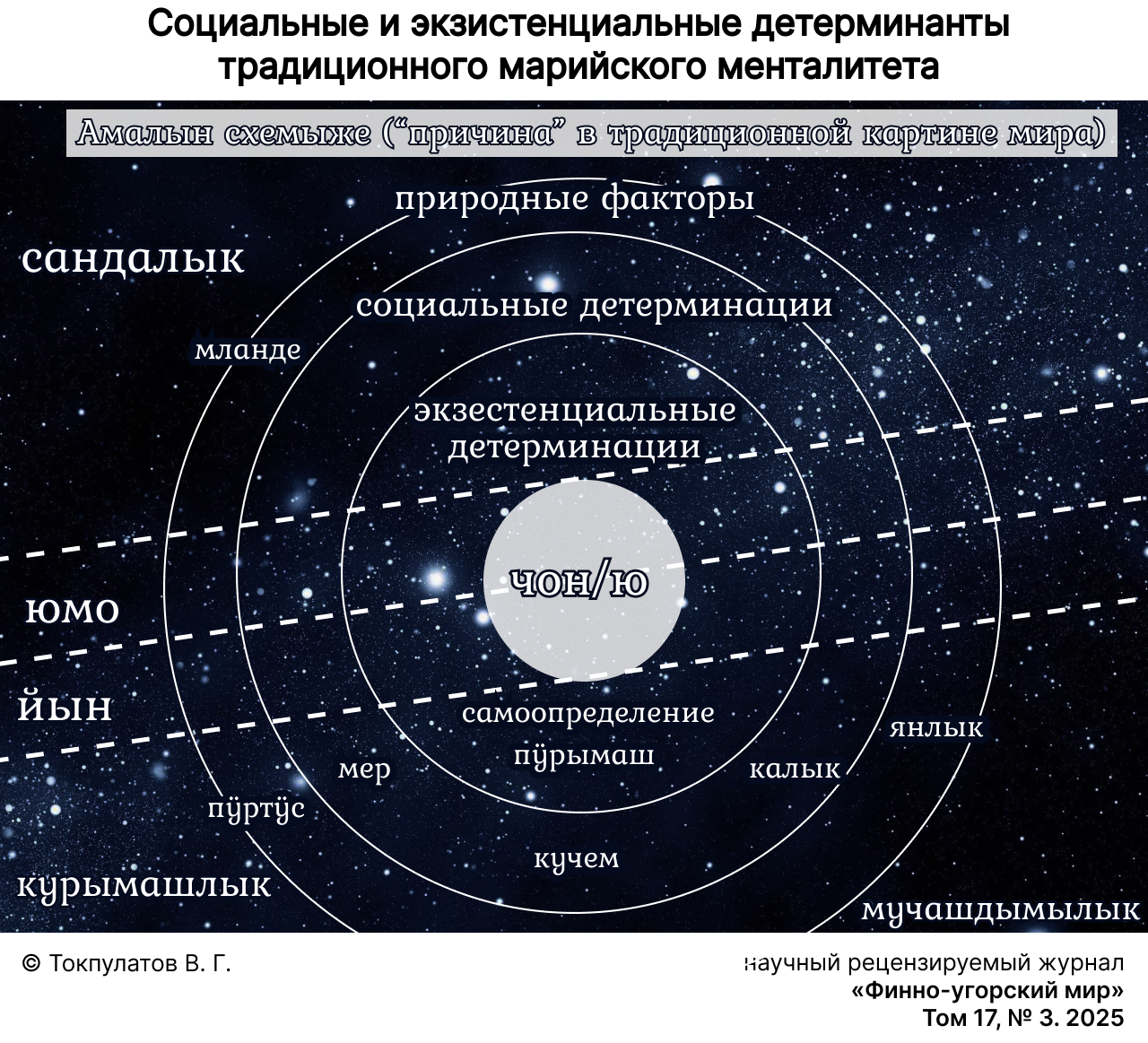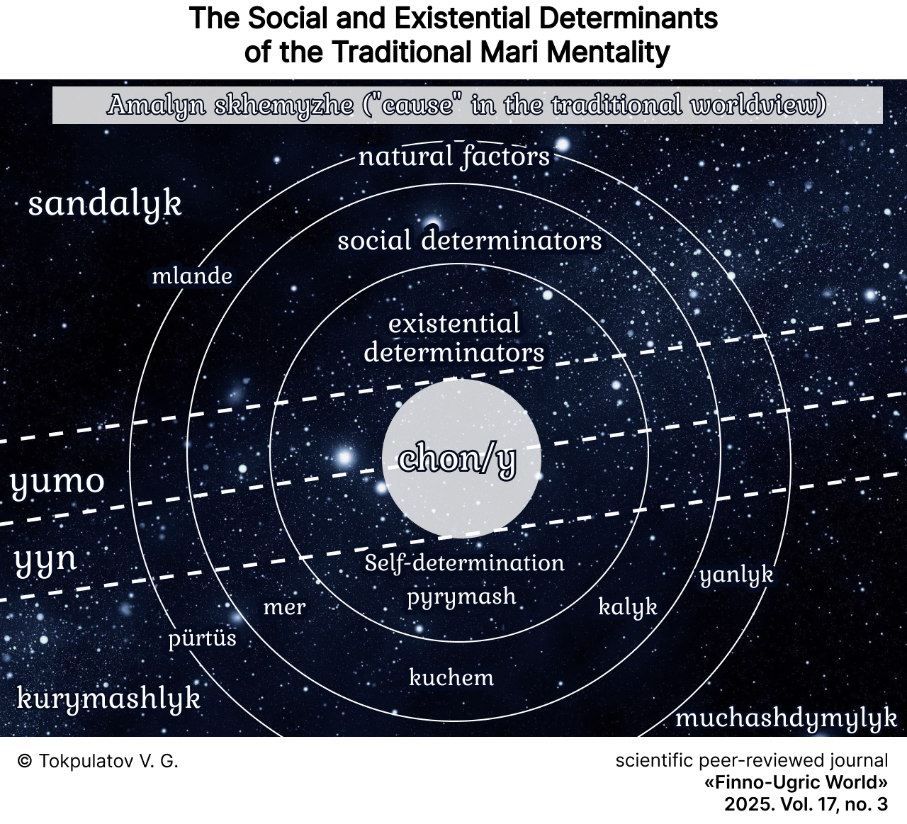 Results and Discussion. Existential determinants, articulated through the concepts of ‘Yumo’ (deity) and ‘chon’ (soul), play a predominant role in the Mari mentality. Social conditions are mediated through spiritual practices, and the Mari worldview is characterized by properties of fractality and heterarchy, which indicates a recurrence of cultural patterns across different levels of being.