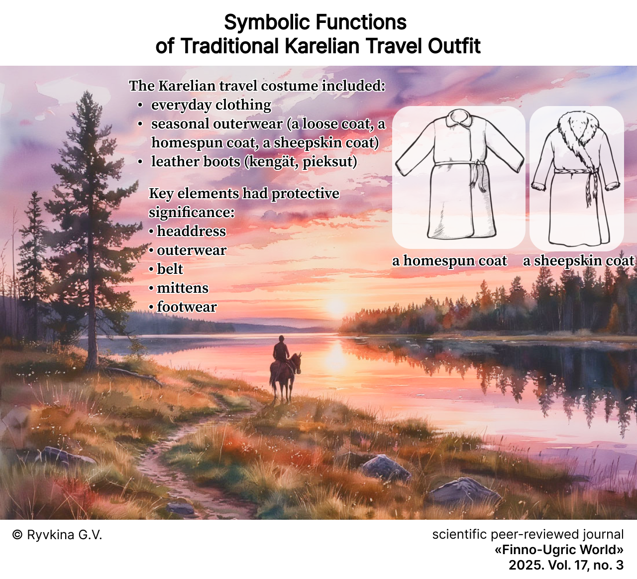 Introduction. In contemporary scholarly literature, there are gaps in the study of the semantics of traditional Karelian clothing, particularly the symbolism of the travel costume, as the culture of mobility among the Karelians has long remained outside the interests of researchers. The aim of the study is to analyze the sign-symbolic functions of the Karelian travel costume, which will provide insights into the mythological beliefs and rituals of the people related to the road, as well as into Karelian spatial mythology as a whole.