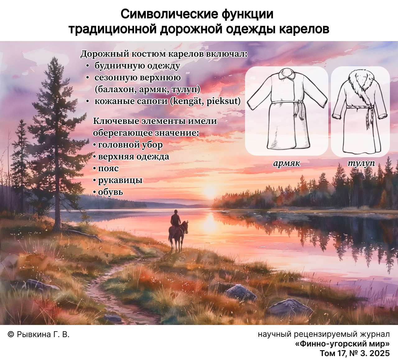 Materials and Methods. The source base of the research comprises archival ethnographic collections and the author’s field materials recorded among southern Karelian groups between 2018 and 2024. In preparing the article, the analysis of the sign-symbolic functions of Karelian clothing was applied within the framework of the functional approach, which made it possible to identify the main components of the travel costume that served as an additional protective amulet.
