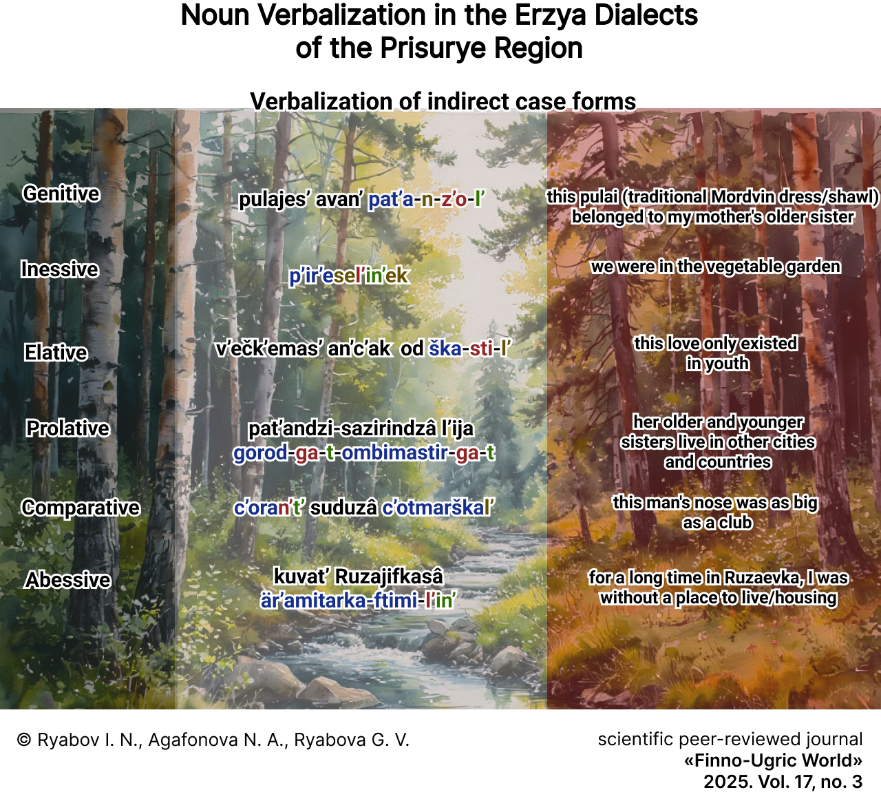 Materials and Methods. The research material comprised dialectal records compiled by the authors during linguistic expeditions conducted in 2022, 2023, and 2024 to Erzya villages in the Prisurye region of the Republic of Mordovia, Penza Oblast, and the Chuvash Republic. The collection of field material was carried out using a questionnaire-based methodology. The following research methods were employed in the study: the descriptive method, which enabled the tracing of the use of verbalized nouns in the dialectal speech of Erzya language speakers; and the comparative and structural methods, which facilitated the identification and illustration of the specific features governing the formation and functioning of the analyzed word forms within the examined linguistic area.