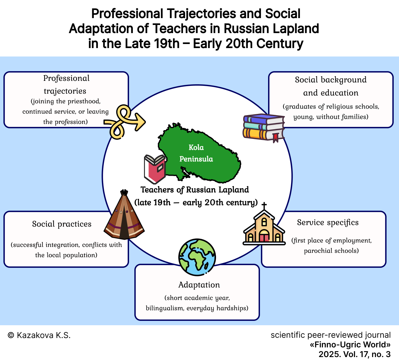 Introduction. The research problematique encompasses issues pertaining to the functioning of the cultural milieu under ‘borderland’ conditions and the adaptation of ethnic cultures and their representatives to both the North and to one another throughout the period under consideration. This work examines the process of the formation of the socio-professional group of teachers within the European Arctic region from the late 19th to the early 20th century, alongside the nature of interethnic interaction with the Sámi population. The study aims to analyse the variability of individual teacher trajectories and to identify the specific characteristics of the teachers’ social adaptation within the Sámi pogosts of Russian Lapland.