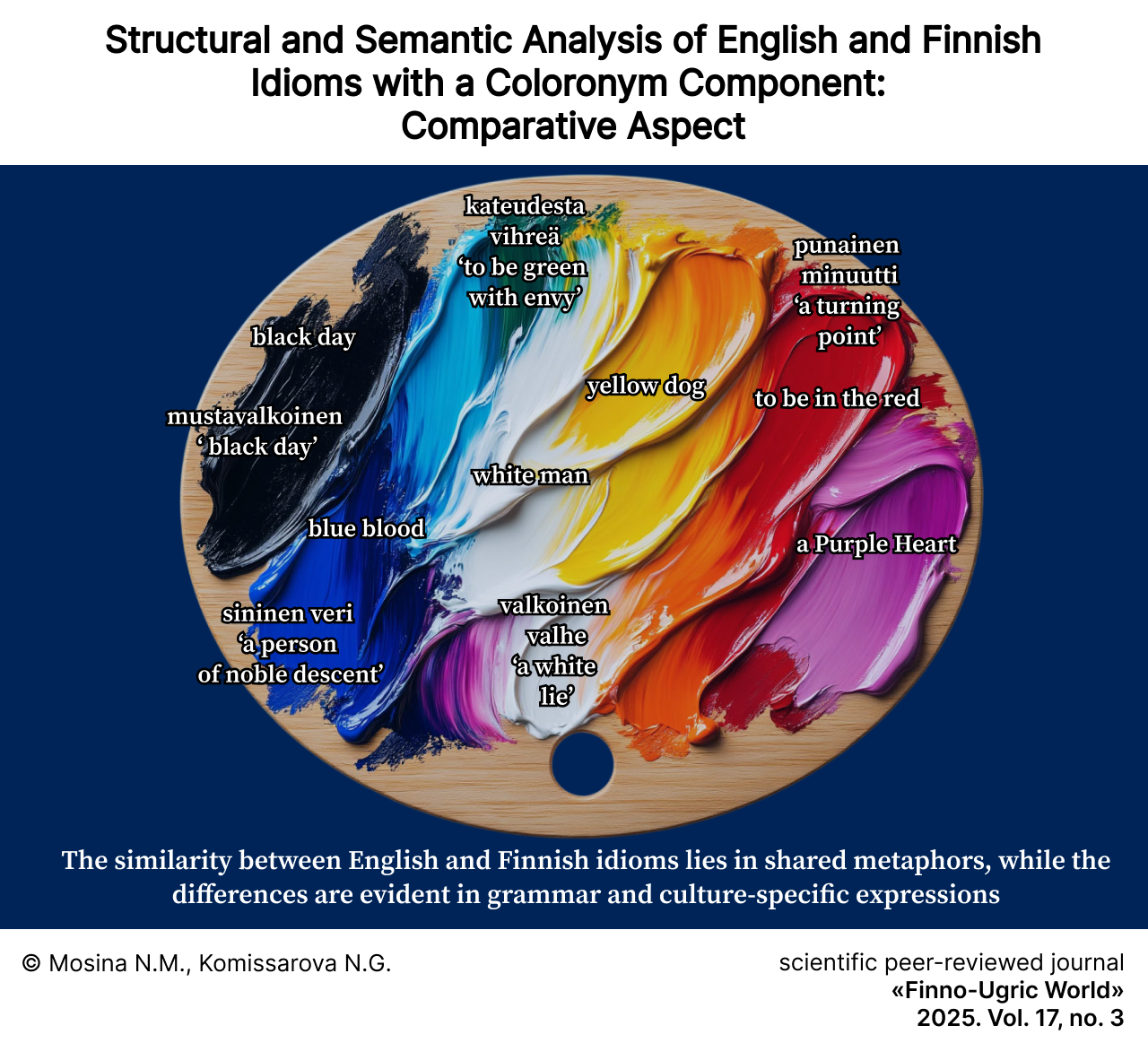 Introduction. The article presents a comparative study of the structural and semantic properties of idiomatic expressions containing a color component (coloronym) in English and Finnish. The relevance of the work is determined by the insufficient study of color perception in cognitive linguistics with respect to this pair of unrelated languages. The aim of the research is to describe the structural and semantic properties and to identify the common features and distinctive characteristics of idiomatic constructions in the English and Finnish languages.
