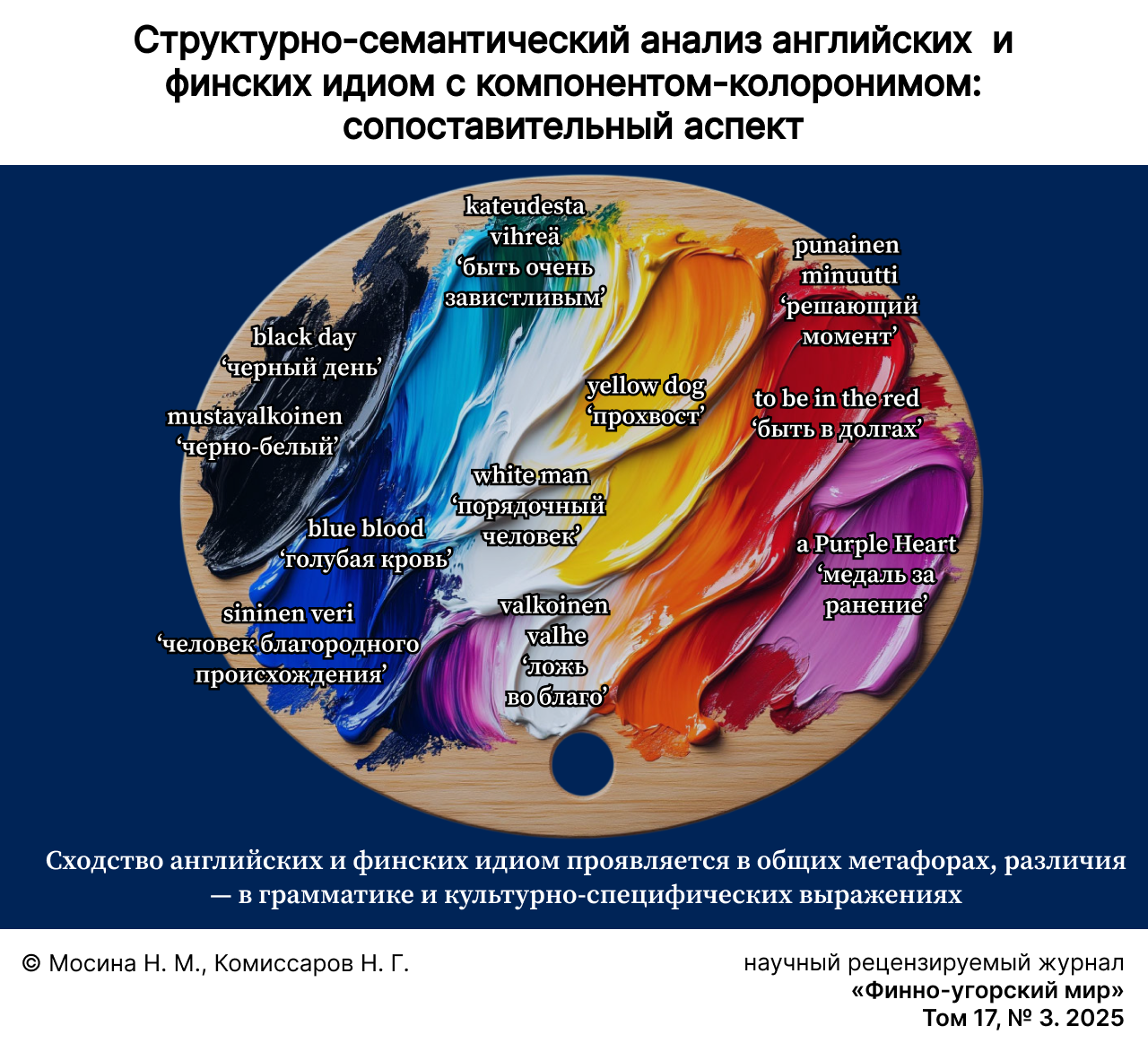 Conclusion. The results demonstrate both symmetry (the universal perception of basic colors) and asymmetry of the lexical systems under study, contributing to the theory of phraseology and cross-cultural research in color semantics. The research materials may be useful in the compilation of comparative phraseological dictionaries of English and Finnish, as well as in the preparation of scholarly works on the lexicology of the languages studied.
