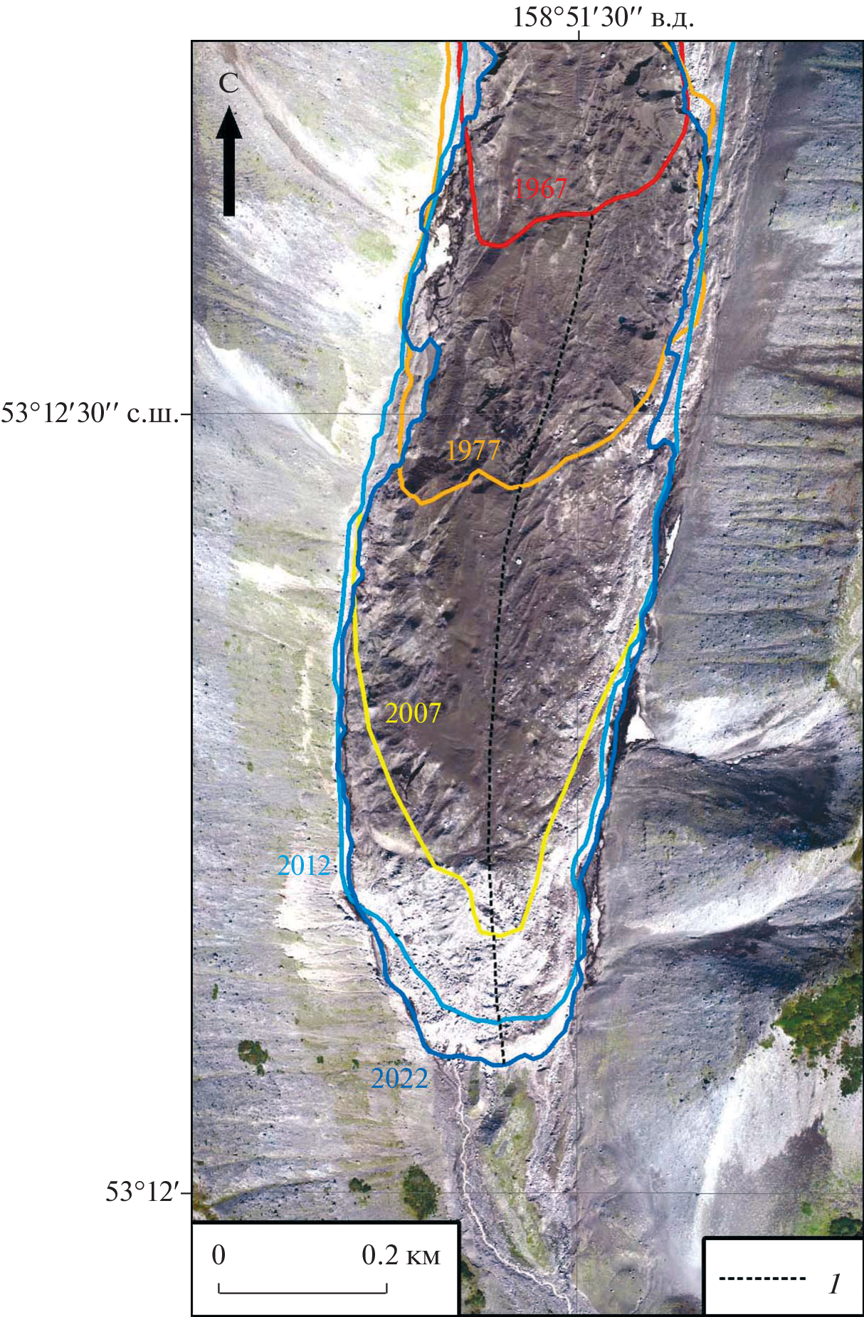 The change in the volume of the Kozelsky Glacier in Kamchatka for the period 1977–2022 (1977–2015 and 2015–2022) was estimated using historical data and modern DEM. During this period, the area of the glacier did not change much. At the same time, its length increased by about 0.7 km, while the width decreased over its almost whole extent. The volume of the glacier decreased by 34.15 ± 6.74 million m3, and its surface became lower by 17.30 m, on the average. The cumulative mass balance amounted 14.70 ± 3.94 m w.e., and the mean annual value –0.33 m w.e. yr–1. In the last 45 years, the ice loss and redistribution to lower hypsometric levels took place on the Kozelsky Glacier. In 1977–2015, the average area change in the altitude of the glacier surface was equal to –17.84 m, the volume decreased by 35.21 ± 7.20 million m3, the cumulative mass balance amounted –15.16 ± 4.17 m w.e., and the mean annual balance –0.40 m w.e. yr–1. In the period 2015–2022, an elevation of the glacier surface was recorded by 0.59 ± 1.55 m on the average, the volume increased by 1.01 ± 2.65 million m3, the cumulative mass balance amounted to 0.50 ± 1.35 m w.e., and the mean annual balance – to 0.07 m w.e. yr–1. During the last decade, a slowdown in the movement of the glacier front down the valley was recorded. In 2012–2022, the glacier front advanced with a velocity of about 5.2 m/year, while it was 17.9 m/year in 1977–2007, and 20.0 m/year in 2007–2012. The current climatic conditions are not favorable for development of glaciers. In 1977–2022, a trend of the summer air temperature rise was observed with a relatively stable amount of precipitation falling during the cold period. The almost continuous (except 1978–1981) advance of the glacier in 1977–2022 can be explained by the influence of the volcanic factor. A thick surface moraine covers more than 2/3 of the glacier area and, thus, prevents the surface ablation. Increased seismic activity associated with active volcanism promotes the ice movement.