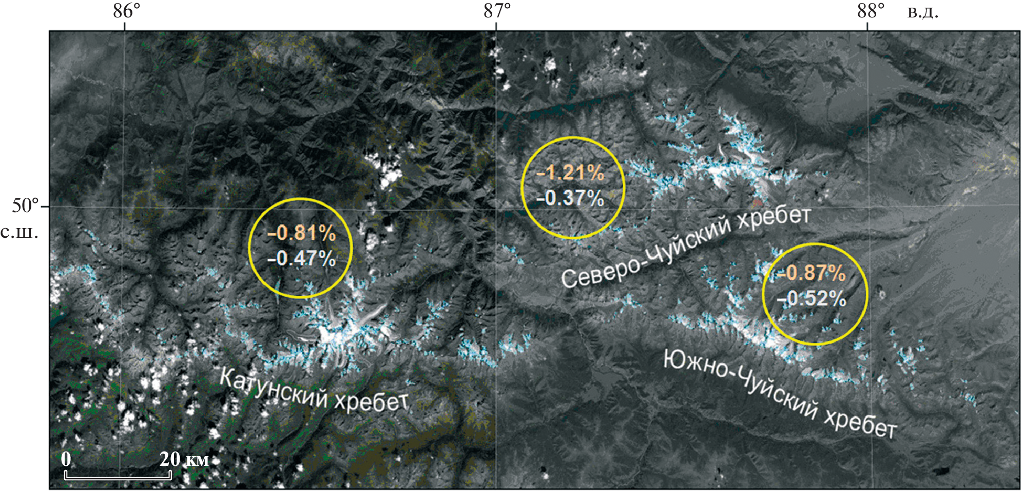 - Khromova T., Nosenko G., Nikitin S., Muraviev A., Popova V., Chernova L., Kidyaeva V. Changes in the mountain glaciers of continental Russia during the twentieth to twenty-first centuries // Regional Environment Change. 2019. No 19. P. 1229–1247. https://doi.org/10.1007/s10113-018-1446-z