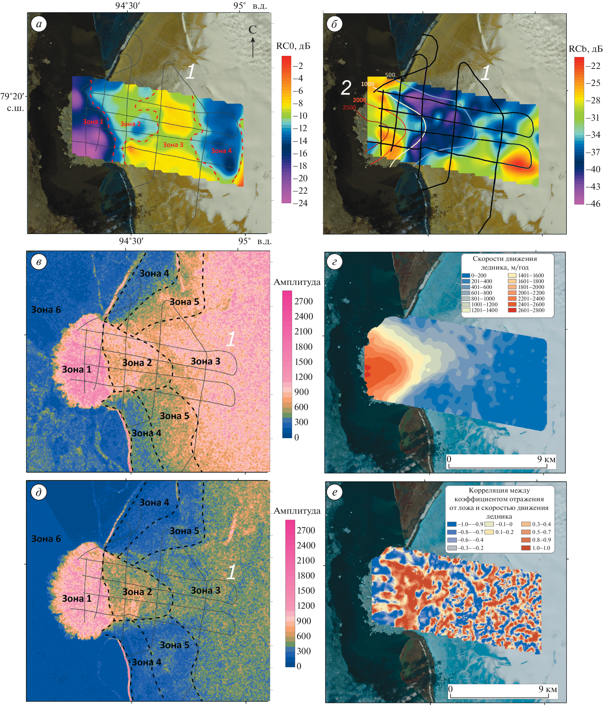 По данным измерений времени запаздывания и амплитуд радиоотражений от ложа ледникового купола Вавилова, полученным в период быстрой подвижки его западной части, определены значения коэффициента отражения от ложа по мощности, которые коррелируют с высокими скоростями (более 1000 м/год) движения ледника в области, наступившей на участок мелководья.