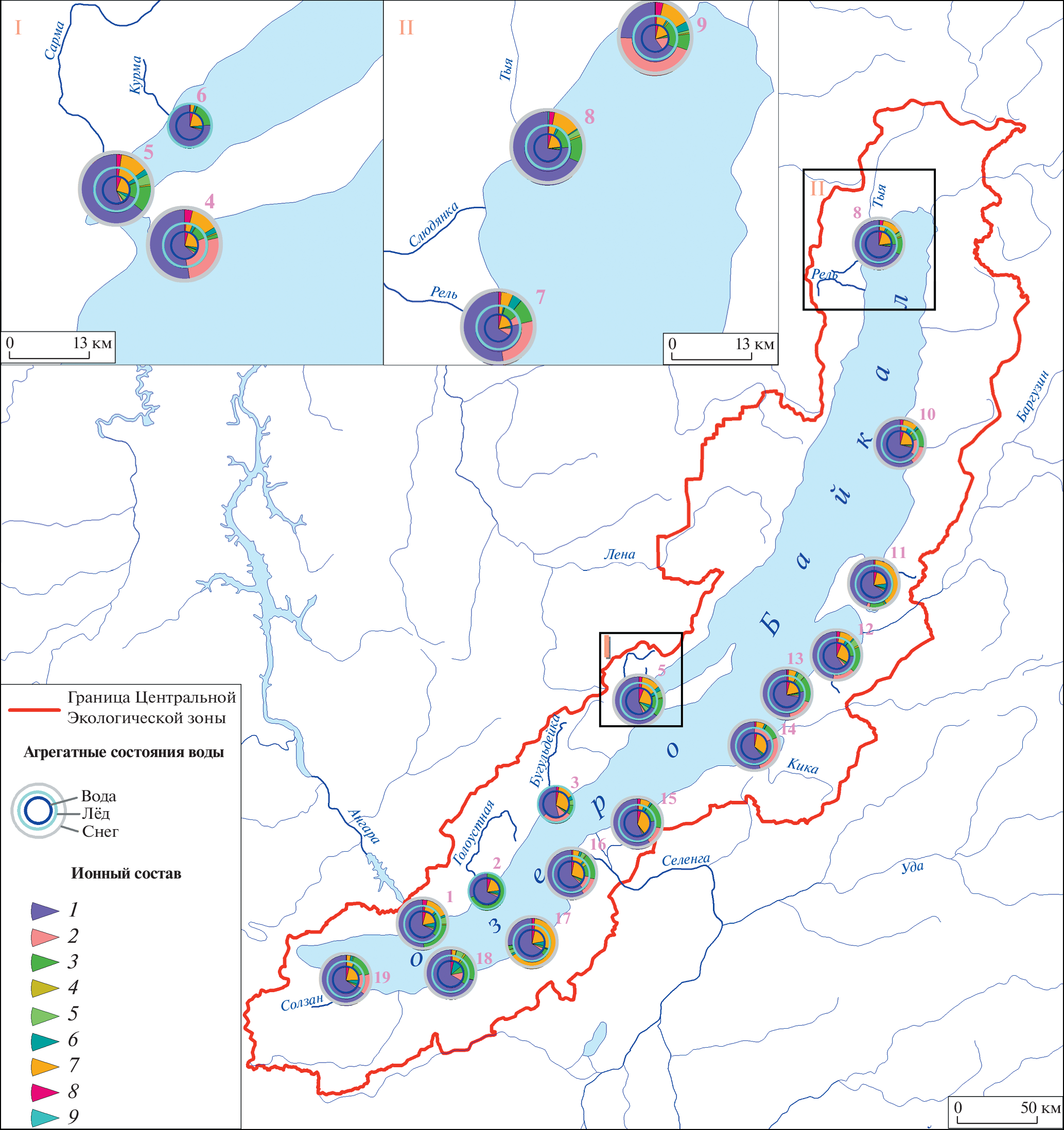 The results of studies of the chemical composition and the basic regularities of migration of macro- and microelements within the hydro-cryogenic system “snow on ice–ice–water under ice” obtained in the winter of 2016/17 in the waters of Lake Baikal are presented. Such investigation over the Lake area was carried out for the first time. It has been found that due to climatic conditions, dates of freeze-up (formation of the ice on the Lake) differ by 7–10 days from North to South, and the depth of snow on ice and its density change over the Lake area by 2 times, however there are some parts without snow. It was found that the changes in the pH indexes were identical across the whole Lake area – minimum pH values are present in the snow (from 5.59 to 7.39), average values – in the ice (6.01–7.50), and maximum values are noted in the water under ice (7.42–8.50). For the most part, increased quantities of suspended matter and an increase in the pH of snow were recorded near settlements, which is obviously a result of the anthropogenic influence. It was determined that the concentration of ions in the ice in relation to their content in the initial solutions decreases within the series: \({\text{NO}}_{2}^{ - }\) > Cl– > \({\text{SO}}_{4}^{{2 - }}\) > \({\text{HCO}}_{3}^{ - }\). Among the cations, K+, Na+ ions are involved into the ice intensively, while the Ca2+ and Mg2+ – weakly. The ice phase is enriched with ammonium ions outside the settlements. Near settlements and in shallow water, quantity of salts in the ice may be close to or equal to their concentration in the water under ice. The coefficient of migration in the water (Kx) divide the chemical elements into two groups – the mobile ones and slow-moving elements. The first group includes Ca, Cu, Sr, Mg, Co, Zn, and Cd (Kx >1), the second one contains Ba, Mn, Si, Fe, Al, Ti, Ni, Cr, P, and K.