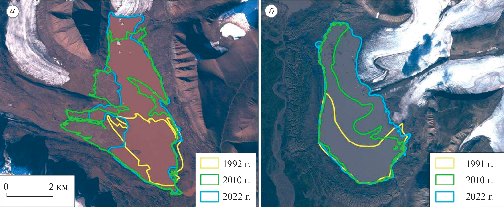 Approximately 3,790 lakes of various genesis existed in the Svalbard archipelago in 2008–2012, the total area of which reached 395 km2. Among them, periglacial lakes were new objects which had been formed since the beginning of the 20th century due to the deglaciation of the archipelago. We found 554 glacial lakes which areas exceeded 0.01 km2. The total area of these lakes amounted to about a half of the area of all the lakes in the archipelago – 185 km2, and two thirds of this value were large glacial lakes. The paper presents the spatial distribution of large periglacial lakes and variability of them caused by the climate warming in the archipelago. At present, there are 35 periglacial lakes (over 1 km2 in size); all of them are in contact with glaciers and the greater part of them are dammed by the terminal moraines or by a glacier itself. According to the cartographic data of the Norwegian Polar Institute and satellite images, the areas of large lakes were determined successively in 1991, 2002, 2012, and 2022. For the period from 1991 to 2012, there was a twofold increase in their area from 24.4 to 53.7 km2, but in 2012–2022 this process slowed down. On the east of the archipelago, where the inland ice is widespread, the process of the lake formation is much slower. It had been noted that on the west all large glacial lakes were formed after 1936 due to active retreat of the glaciers. At the same time, both on the north and east, most of the large glacial lakes existed prior to 1936. During the periods under consideration, changes in the areas of individual objects reached multiple values. The most large-scale changes in the lake areas were associated with the ablation of glacial fronts in contact with the lake, a glacier surge, and outbursts of a few dammed lakes. Six lakes were identified, where the water level drop reached tens of meters. Despite the slowdown in the formation of lakes in the last decade, the enlargement of lakes continues. Relative increase in the total area of the large periglacial lakes over the past 30 years on the west and east of the archipelago is in direct proportion to decreasing in glaciation of these regions. Thus, the process of formation of large periglacial lakes may be used as an indicator of climate change in the archipelago.