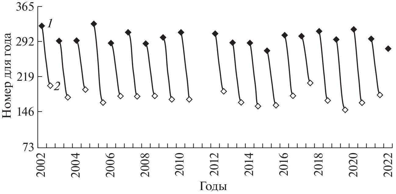 Variability of the Pechora Sea ice cover and the Barents Sea surface temperature during the season from October to June in 2002–2022 (except the season of 2011/2012) was studied on the basis of satellite observations and reanalysis ERA5. Influence of the sea surface temperature on the ice cover was also analyzed but without considering the other hydrometeorological parameters. Areas of the sea ice cover characteristics were calculated using data on the sea ice closeness obtained from the Advanced Microwave Scanning Radiometer 2 measurements. To analyze the variability of sea surface temperature, we used the average daily data of the European Centre for Medium-Range Weather Forecasts ERA5 reanalysis obtained by averaging hourly data. To study the spatial and temporal variability of sea ice cover and sea surface temperature, fields of daily averaged parameters were mapped. These maps and values of areas of the sea ice cover were analyzed. This made possible to reveal regularities of development of the sea ice processes in the Pechora Sea, to calculate the general trend of the sea ice area change over the considered period of time, and to divide the Barents Sea into four sectors with significantly different average values of the sea surface temperature: southwestern, northwestern, southeastern, northeastern ones. The seasonal and interannual variabilities of the Pechora Sea ice cover and the Barents Sea surface temperature were analyzed. To study the effect of sea surface temperature in different sectors of the Barents Sea on the sea ice area, the method of statistical analysis (Pearson’s linear correlation) was used for the monthly average data and the data, averaged over the sea ice season (from October to June) with different time lags. Significant correlation coefficients were obtained only for a two-month lag. With such a lag, high values of the inverse correlation coefficients were revealed between the sea surface temperature in the southwestern (up to –0.8) and northwestern (up to –0.6) sectors of the Barents Sea and sea ice area of the Pechora Sea, while in other sectors the correlation was significantly smaller or even below the significance level.