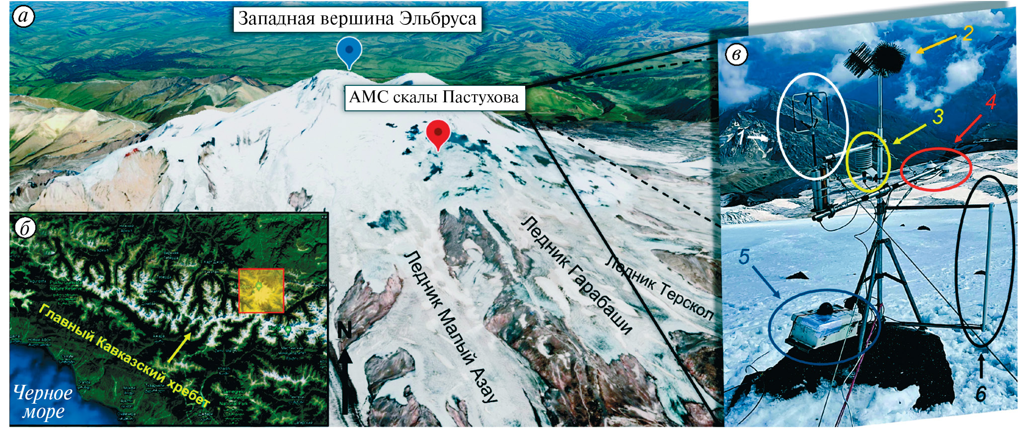 1 — акустический анемометр Gill; 2 — “грозозащитные ершики”; 3 — термогигрометр Rotronic; 4 — балансомер HukseFlux; 5 — ящик с логгером Campbell и устройством мобильной передачи данных; 6 — акустический метелемер ISAW FlowCapt4. Пунсонами показаны: АМС “Скалы Пастухова” — измерительный полигон (высота 4720 м над ур. моря) и западная вершина вулкана Эльбрус (5642 м над ур. моря). Для создания данного рисунка использованы материалы Google Earth (www.earth.google.com).
