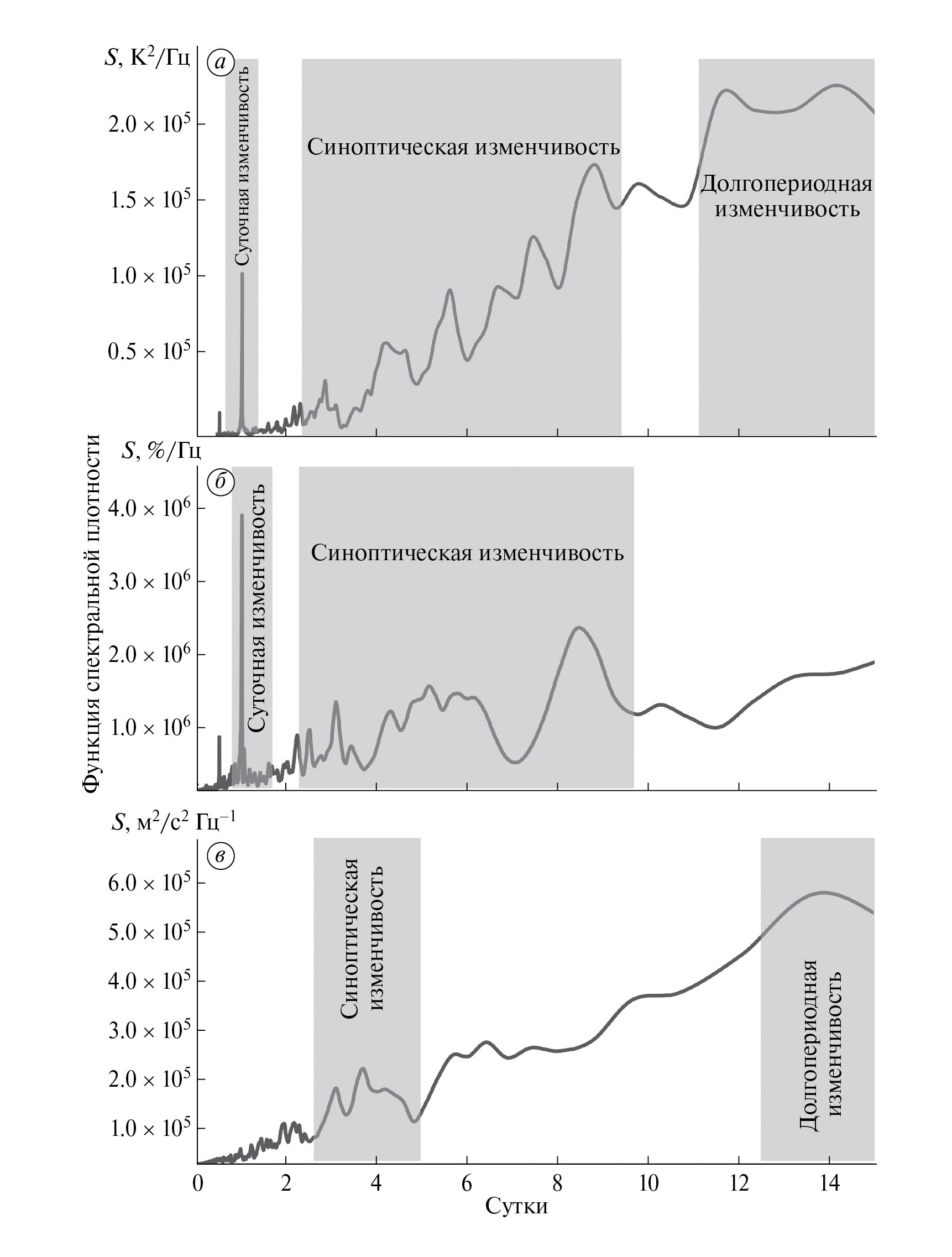 Также был выполнен расчёт функций спектральной плотности для рядов температуры, относительной влажности и скорости ветра (рис. 3). Поскольку длина ряда измерений составила около 270 суток при временнóй дискретности измерений 1 минута, выявленные колебания периодом от нескольких часов до 2–5 суток можно считать достоверными. Колебания с периодом более 15 суток не рассматриваются, поскольку их статистическая значимость требует длину выборки не менее 3 лет. Колебания с периодом от 6 до 14 суток, выявленные по итогам спектрального анализа полученного ряда наблюдений, строго говоря, обеспечены недостаточным объёмом выборки, поэтому к ним следует относиться осторожно.