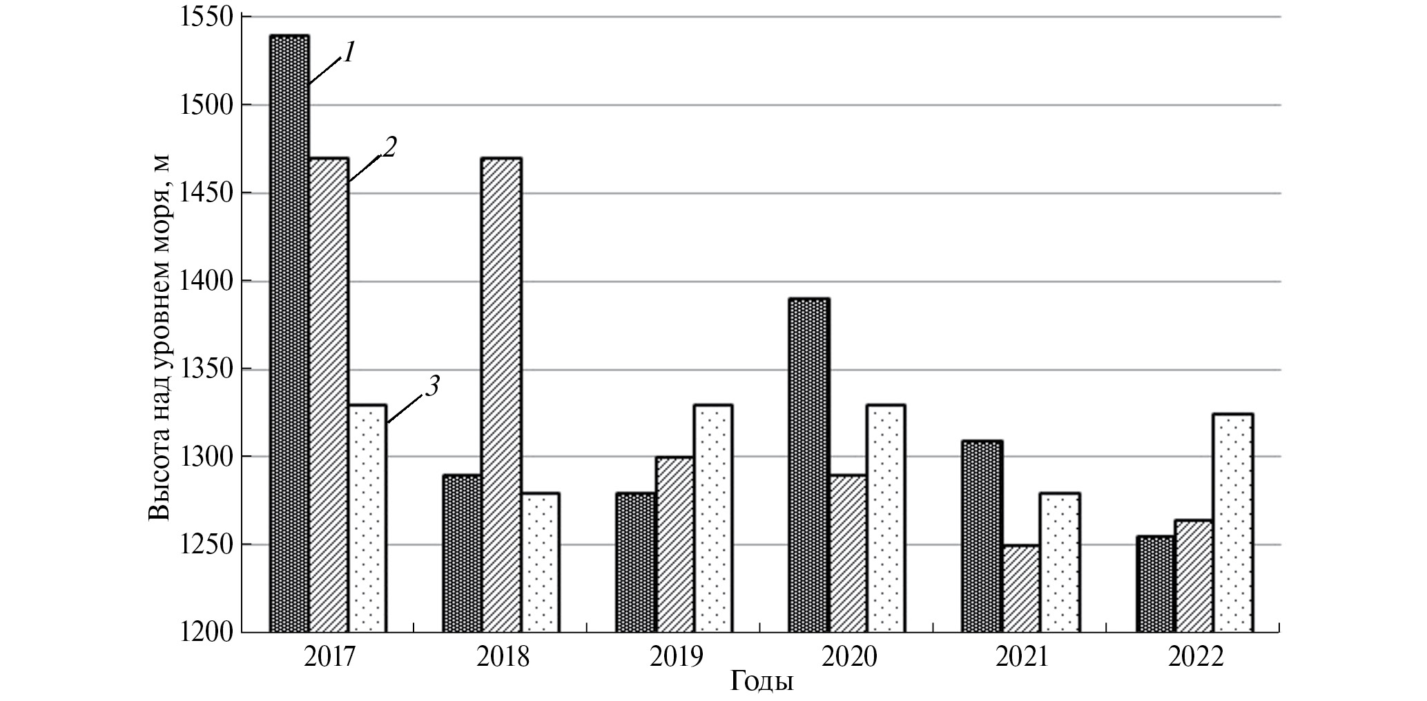 Положение лавинных снежников в указанных лавиносборах установлено нами за период 2017–2022 гг. на основе анализа весенних снимков спутников Sentinel по их нижнему краю. Сравнение свидетельствует о том, что лавинная активность в них не отличается строгой синхронностью (рис. 4).