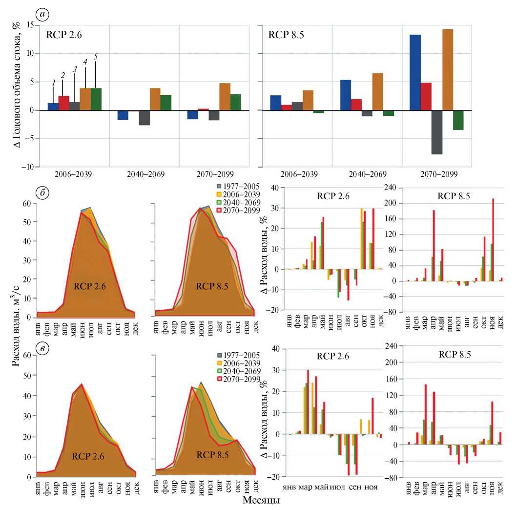 Fig. 6. Anomalies of the average monthly discharges relative to the base historical period (а: 1 — Baksan–Tyrnyauz; 2 — Baksan–Zayukovo; 3 — Chegem–Nizhny Chegem; 4 — Malka–Kamennomostskoye; 5 — Terek–Kotlyarevskaya), transformation of the intra–annual flow distribution and its anomalies in the Baksan River – Tyrnyauz (б) and the Chegem River – Nizhny Chegem (в) in scenarios RCP2.6 and RCP8.5