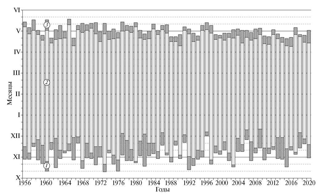 Fig. 2. Timing of the onset of phases of the ice regime of rivers on the western coast of the White Sea (Republic of Karelia, Arkhangelsk region): freezing (1), freeze-up (2), break-up (3) for 1956–2020