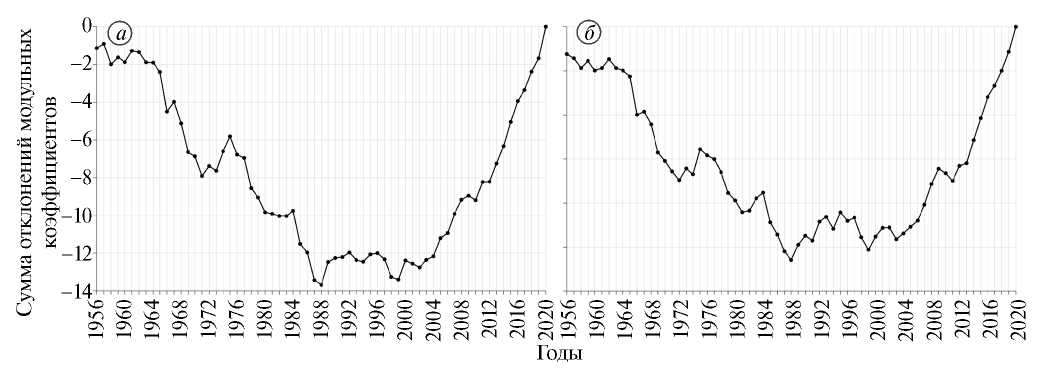 Рис. 3. Разностно-интегральные кривые средней за холодный сезон температуры воздуха (а) и продолжительности ледовых явлений на реках (б) западного побережья Белого моря (Республика Карелия, Архангельская область) за 1956–2020 гг.