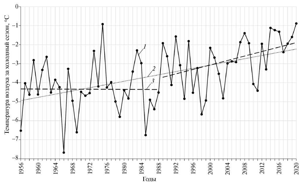 Fig. 4. Long-term fluctuations of average air temperature during the cold season on the western coast of the White Sea (1) and its linear trends for the time periods 1956–2020 (2), 1956–1990 and 1991–2020 (3)