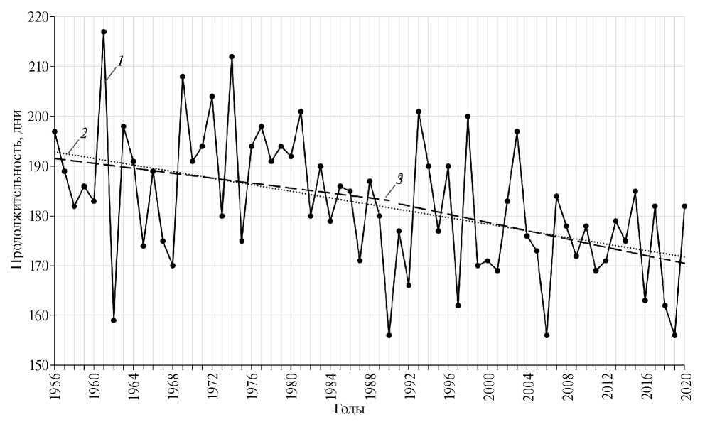 Рис. 5. Хронологический график продолжительности периода с ледовыми явлениями на реках западного побережья Белого моря (1) и её линейные тренды за временные периоды 1956–2020 гг. (2), 1956–1990 и 1991–2020 гг. (3)