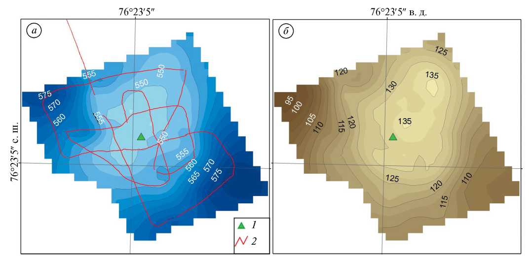 Рис. 3. Схема распределения толщины льда (а) и рельефа подлёдного ложа (б) в районе скважины: 1 – положение скважины; 2 – профили радиолокационного зондирования