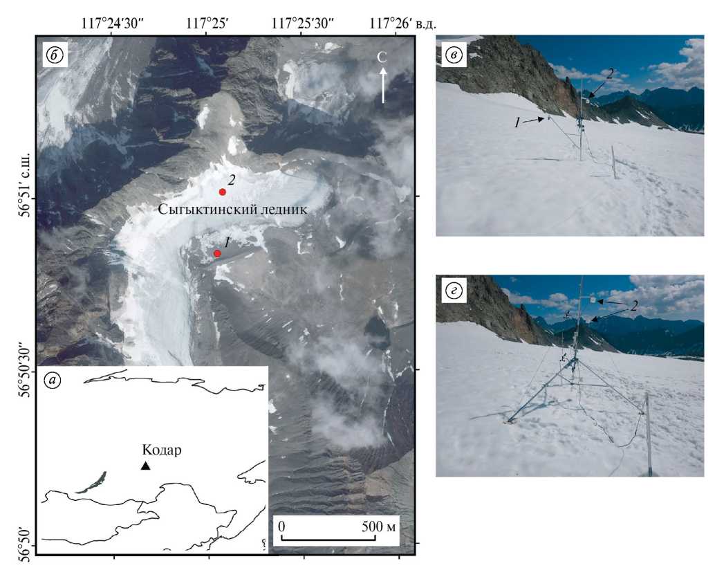 Fig. 1. Location of the study area. North Asia and Kodar Range (а); Sygyktinsky Glacier and automatic weather stations (б): 1 – on moraine, 2 – on glacier; automatic weather station (July 2021) installed on mast (в) and on tripod (г): 1 – ultrasonic sensor; 2 – temperature and relative humidity sensors