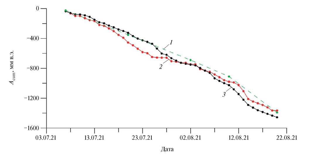 Fig. 2. Curves of cumulative ablation (Acum) at the weather station installation point for the period from July 7 to August 20, 2021 obtained by different methods: 1 – ablation stake measurement (Ар); 2 – ultrasonic sensor measurement (Ауз); 3 – energy balance calculation (Атб)
