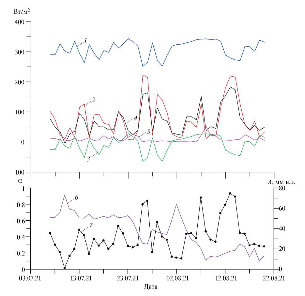 Fig. 3. Daily averages of energy fluxes, albedo (α) and ablation (A) for the period from July 6 to August 20, 2021: 1 – incoming longwave radiation; 2 – net shortwave radiation; 3 – net longwave radiation; 4 – net radiation; 5 – turbulent heat (H+LE); 6 – albedo; 7 – ablation