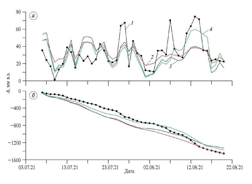 Fig. 4. Glacier ablation for the period 7.07-20.08.2021 calculated by different methods: (а) mean daily ablation (A), (б) cumulative ablation (Acum): 1 – ablation calculated from the heat balance (Атб); 2 – TM1 model; 3 – TM2 model with constant kt; 4 – TM2 model with variable kt