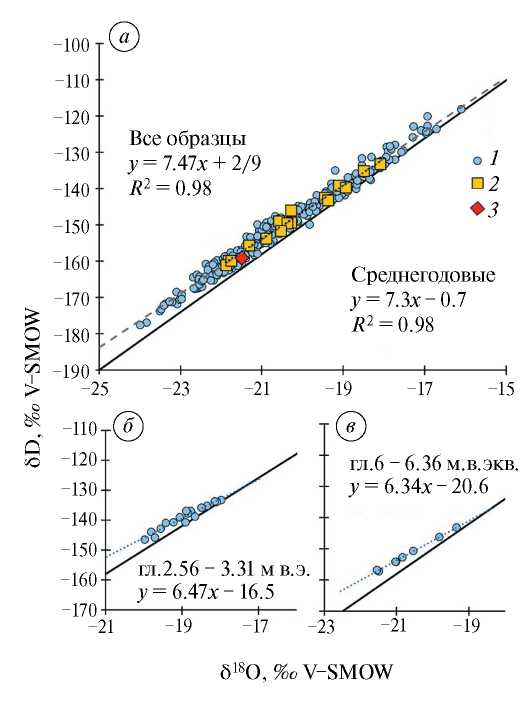Fig. 3. The δ18О-δ2Н ratio for glacial ice samples: a – all samples (1), average annual values (2) and average for core K-2 (from Sato et al., 2013; Shiraiwa, Yamaguchi, 2002); б – samples from depths of 2.56–3.31 m eq.; в – samples from depths of 6.0...6.36 m w.e.
