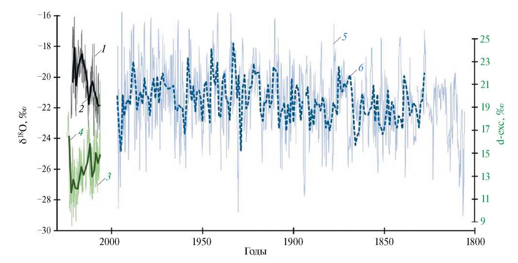 Fig. 4. Distribution of δ18О and d-excess values obtained in 2022 for glacial ice in the Gorshkov crater relative to those previously established in the K–2 core (Shiraiwa, Yamaguchi, 2002): 1 – all δ18О values, 2 – average annual δ18О values, 3 – all values d-excess, 4 – average annual values of d-excess, 5 – δ18О values in core K-2, 6 – average annual δ18О values in core K–2