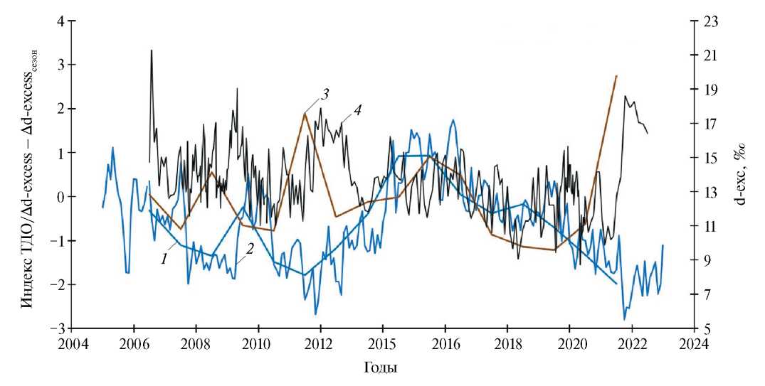Сопоставление величины d-excess льда керна 2022 г. с индексом Тихоокеанского декадного колебания (ТДО) показало, что в некоторых случаях отмечается выраженная обратная корреляция, которая также наиболее сильно проявляется для 2011–2012 и 2021–2022 гг. (рис. 6).