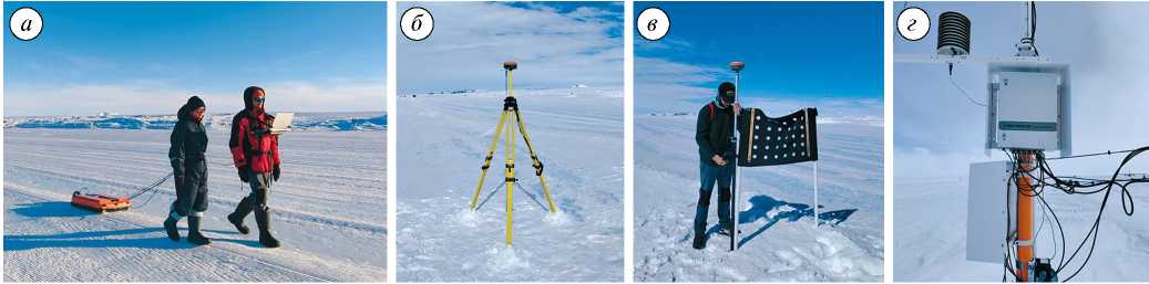 Рис. 2. Выполнение работ в районе посадочной площадки: съёмка георадаром ОКО-3 с антенной 150 МГц (а); базовая станция EFT M2 (б); измерения ровером EFT M2 (в); автоматическая метеостанция Milos 520 (г)