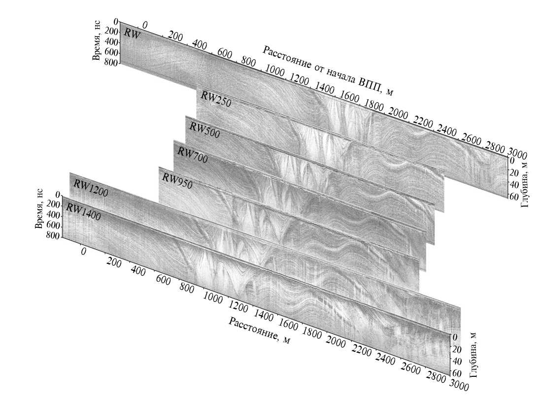 Георадиолокационные исследования позволили оценить характеристики трещин на самой взлётно-посадочной полосе и выявить их положение на участке к югу от её центра, где они не были видны из-за снега. На рис. 3 представлен накидной монтаж временных георадарных разрезов, полученных по рядовым маршрутам съёмки. Самый северный (верхний) из них получен по профилю вдоль оси взлётно-посадочной полосы, а остальные располагаются к югу от неё на расстояниях 250, 500, 700, 950, 1200 и 1400 м (см. рис. 1). Такое отклонение к югу было выполнено для изучения характера сочленения ледяных потоков, выявленных в ходе рекогносцировочных работ 2021 г. (Попов и др., 2022), поскольку именно эти зоны наиболее динамичны.