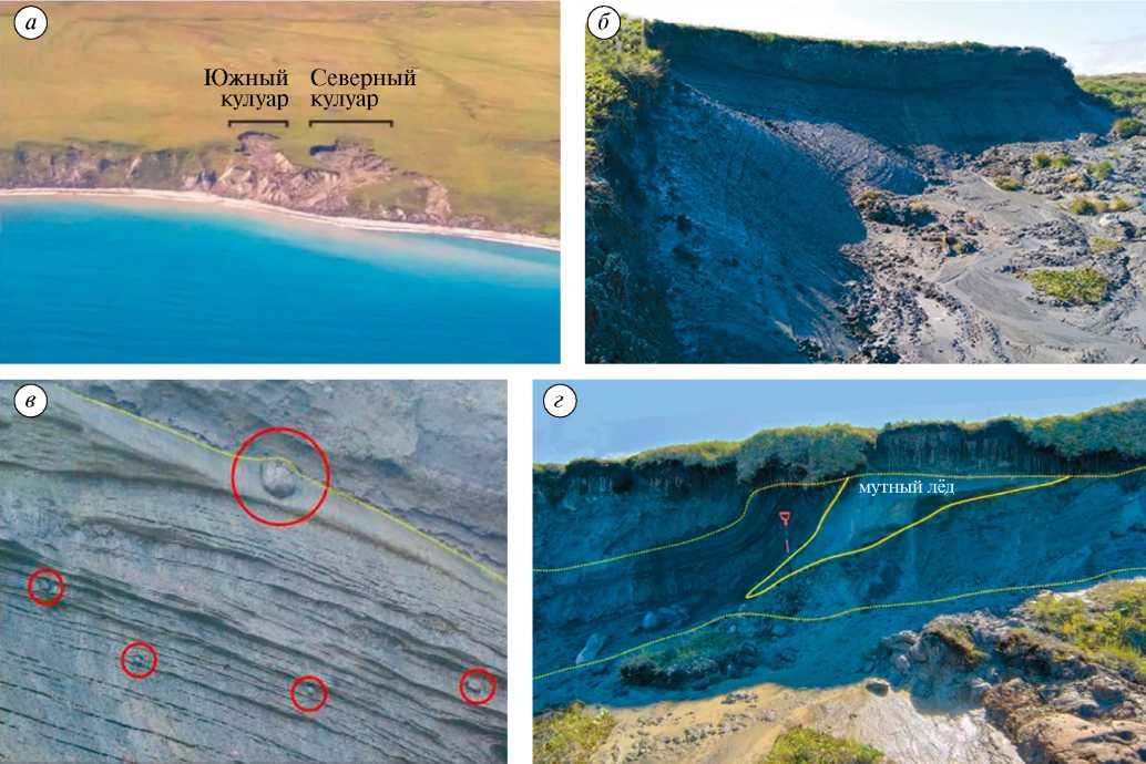 Fig. 5. Lavrentiya deposit: а – general view of the thermal cirque and outcrops of massive ice (highlighted in red) in 2023; б – close-up of ice from the deposit; в – characteristic layering of ice on the melting wall. Photo by A.A. Maslakov