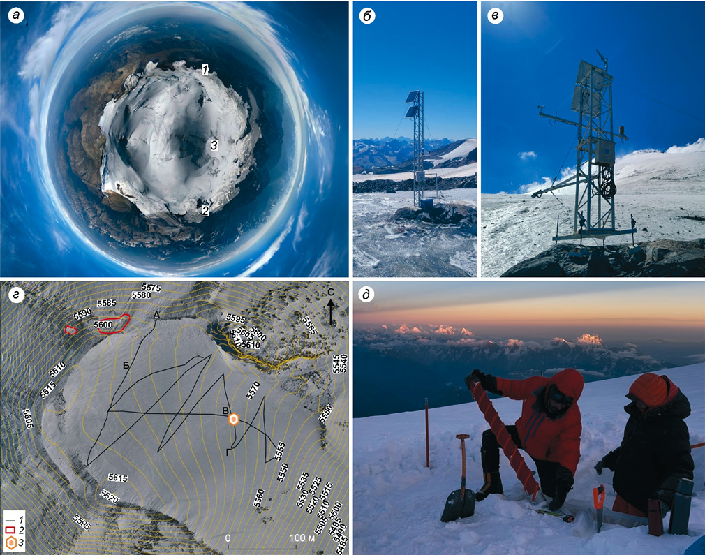 2. Fig. 1. Study area: (а) general view from UAV, AWS sites undicated: 1 – on Mikelchiran Glacier, 2 – on Garabashi Glacier, 3 – study site in the crater near the Elbrus East Summit; (б) AWS on Garabashi Glacier; (в) AWS on Mikelchiran Glacier; (г) – studies in the crater of the East Elbrus Summit: 1 – RES profiles, 2 – fumarole fields, 3 – snow pit and drilling site