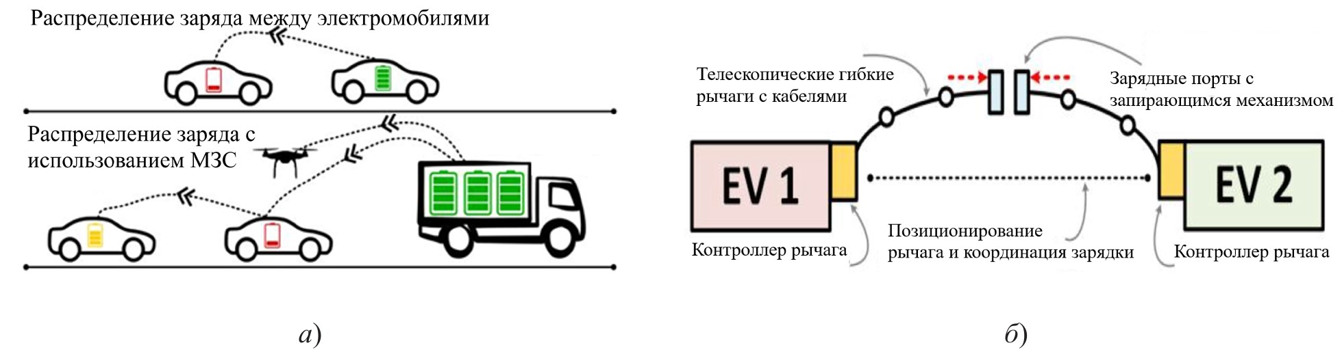Ученые из Университета Флориды предложили новую идею зарядки электромобилей, названную «одноранговая (P2C2) система зарядки электромобилей». Эта система позволяет электромобилям заряжаться без остановки. Для этого необходимо иметь электромобиль с мощными аккумуляторами или мобильную зарядную станцию. По специальной технологии при приближении к заряжающемуся электромобилю с помощью специальных магнитных разъемов крепятся телескопические рычаги, заряжающие аккумуляторы электромобиля (рисунок 5). Также рассматривается возможность беспроводной зарядки [13].