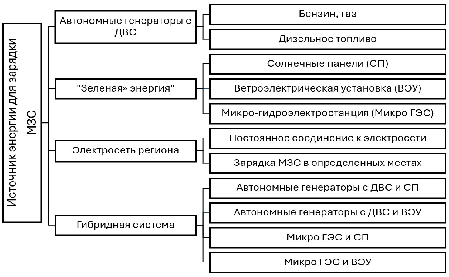 Для обеспечения независимой работы мобильных зарядных станций с аккумуляторами необходим источник энергии для зарядки. Анализ мирового опыта использования МЗС показывает, что для Республики Таджикистан приемлемыми формами МЗС являются следующие (см. рисунок 6):