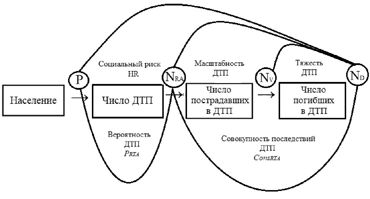 Прежде всего, необходимо представить процесс формирования дорожно-транспортной аварийности в виде причинно-следственной цепочки [7; 8] (рисунок 1) и связать блоки этой цепочки с характеристиками дорожно-транспортной аварийности (Социальный риск; масштабность ДТП; тяжесть ДТП) и частными характеристик рисков аварийности (вероятность ДТП PRTA и Совокупность последствий ДТП ConsRTA).
